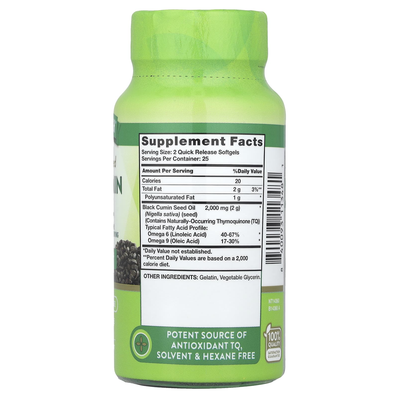 Essas cápsulas softgel de liberação rápida fornecem 2.000 mg de Óleo da Semente de Cominho Preto por dose. Nosso Óleo da Semente de Cominho Preto virgem é prensado a frio, o que significa que é cuidadosamente extraído das sementes usando um processo de alta pressão sem aplicação externa de calor. Como calor ou oxigênio são usados durante esse método especializado, uma quantidade maior dos nutrientes naturais do Óleo da Semente de Cominho Preto pode ser preservada e fornecida a você nessas cápsulas softgel convenientes de liberação rápida.
