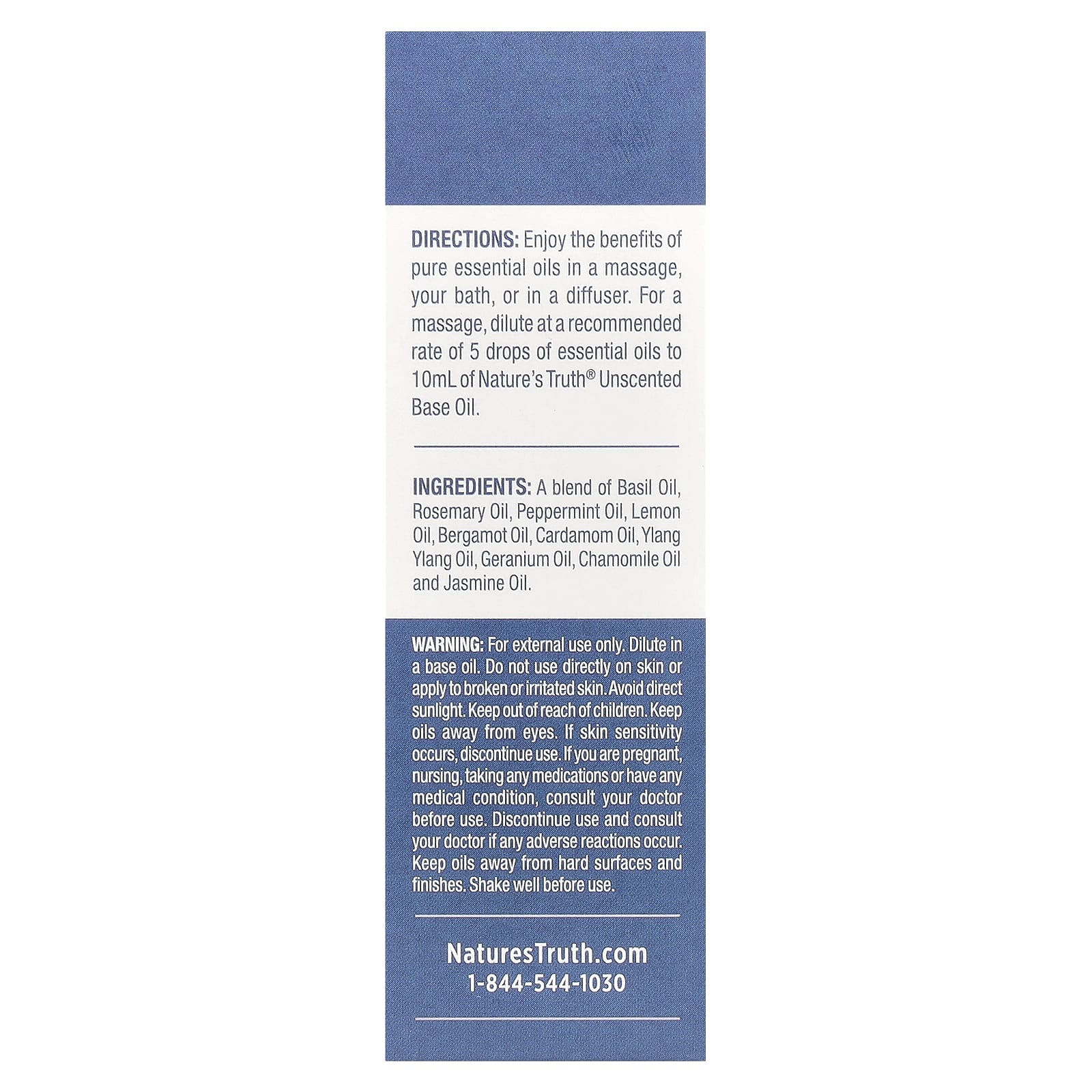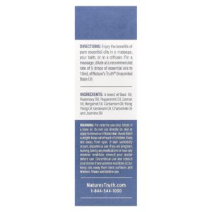 Desfrute dos benefícios dos óleos essenciais puros em uma massagem, no banho ou em um difusor. Para uma massagem, dilua a uma taxa recomendada de 5 gotas de óleos essenciais em 10 ml de Óleo Base Sem Perfume da Nature’s Truth®.