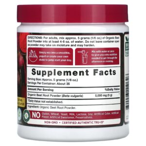 Para adultos, misture aprox. 5 gramas (1/6 oz.) De Pó de Beterraba Orgânica em pelo menos 4 a 6 oz. de água. Não deixe o recipiente aberto, pois o pó pode absorver umidade e endurecer.
