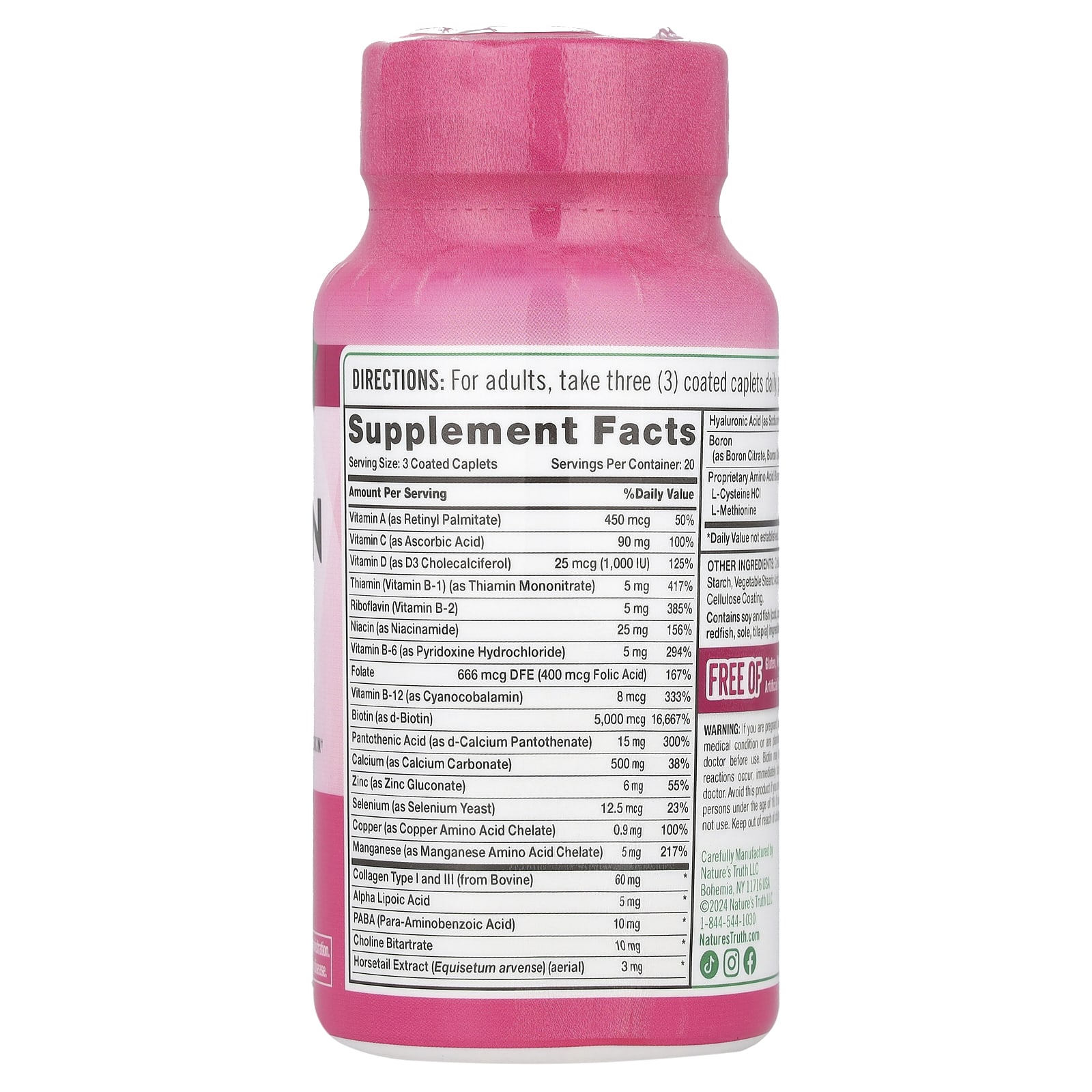 Se estiver grávida, amamentando, tomando qualquer medicamento, tiver algum problema de saúde ou estiver planejando fazer um exame laboratorial, consulte seu médico antes de usar o produto. a biotina pode interferir em testes laboratoriais. Em caso de reações adversas, interrompa o uso imediatamente e consulte um médico. Evite tomar este produto se for alérgico a levedura. Este produto não deve ser usado por pessoas menores de 18 anos. Não use se o lacre sob a tampa estiver danificado ou faltando. Mantenha fora do alcance de crianças. Armazene em local fresco e seco.