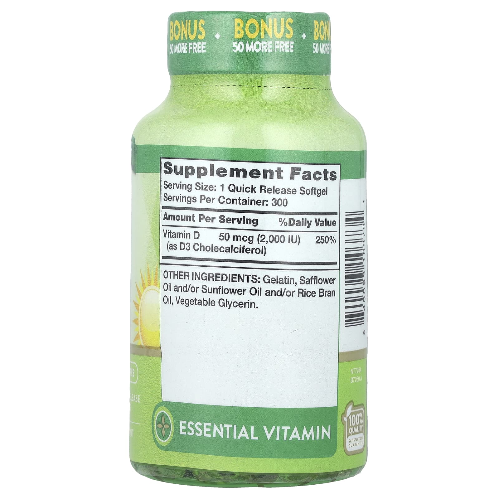 Cada dose de nossas cápsulas softgel de Vitamina D3 fornece 50 mcg ou 2.000 UI de Vitamina D como Colecalciferol D3. Basta uma cápsula softgel de liberação rápida por dia para atender aos valores diários recomendados desta vitamina essencial. Esta fórmula de alta potência pode ser facilmente integrada na sua rotina diária. Além disso, este frasco tamanho bônus fornece mais 50 cápsulas softgel gratuitamente, fornecendo uma quantidade de 300 cápsulas softgel de liberação rápida.