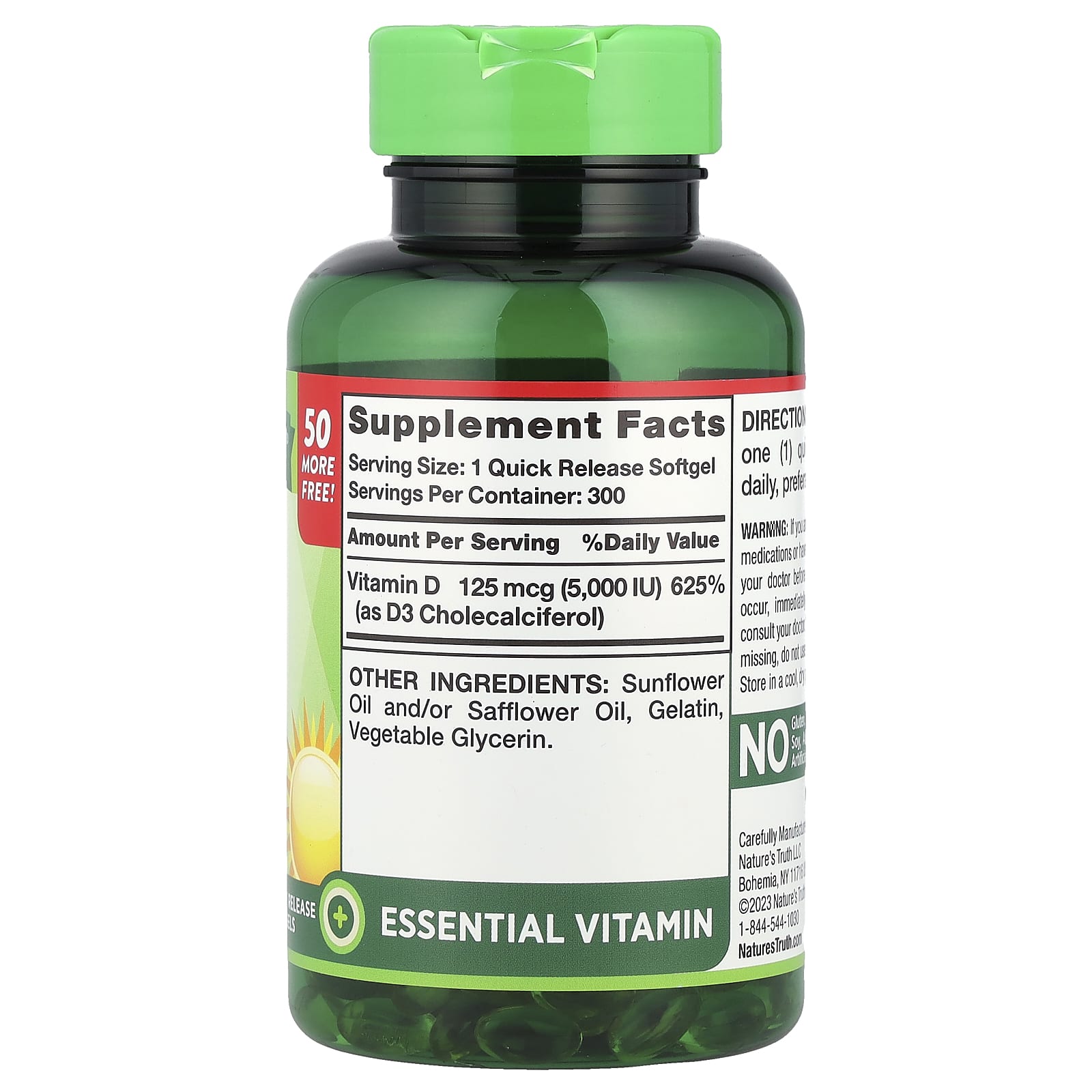 Natures Truth Vitamina D3 de Alta Potência 125 mcg (5.000 UI) 300 Cápsulas Softgel de Liberação Rápida – Nature’s Truth Suplementos Vitaminas Vitamina D.