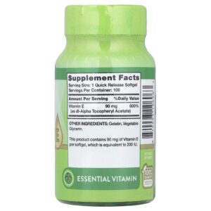 Naturalmente encontrada em alimentos como frutas, vegetais e cereais, a Vitamina E é um antioxidante que contribui para um estilo de vida saudável.† Nossa fórmula exclusiva fornece 90 mg (200 UI) de Vitamina E, como Acetato de Racealfatocoferol, por cápsula softgel de liberação rápida, sendo uma adição maravilhosa à sua rotina de bem-estar.
