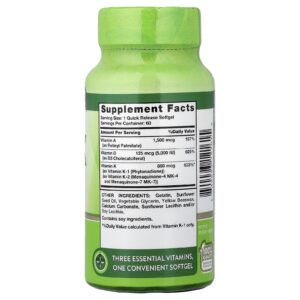 Obtenha três vitaminas por dia na facilidade de uma única cápsula softgel de liberação rápida com as cápsulas softgel de alta potência da Nature’s Truth! Um por dia é tudo de que você precisa e fornece suporte de vitamina A como palmitato de retinol, vitamina D como colecalciferol D3, vitamina K1 como fitomenadiona e vitamina K2 como MK-4 e MK-7.