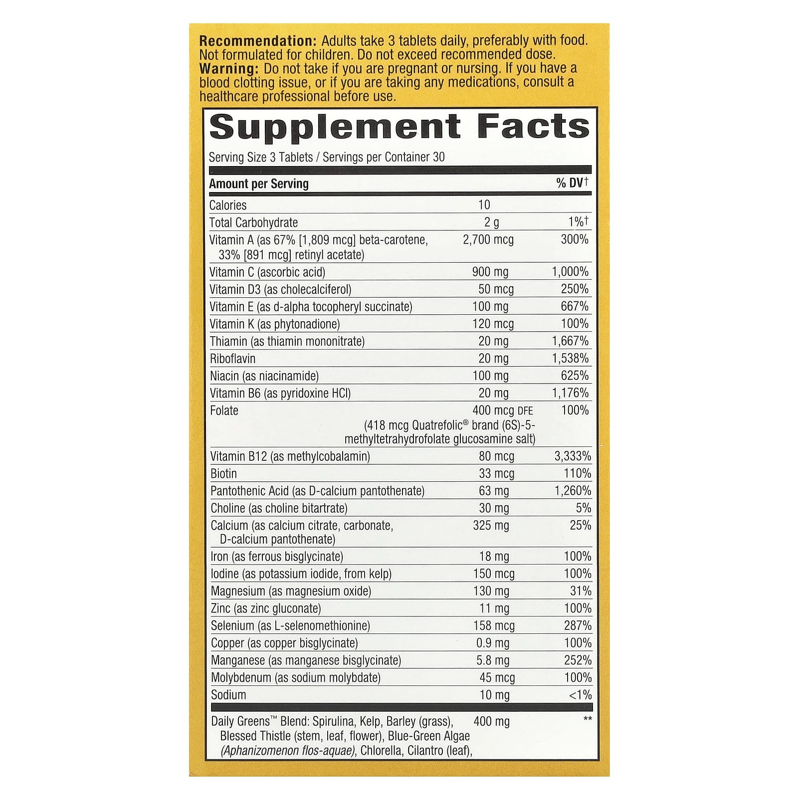 Adultos devem tomar 3 comprimidos por dia, de preferência com alimentos. Não formulado para crianças. Não exceda a dose recomendada.