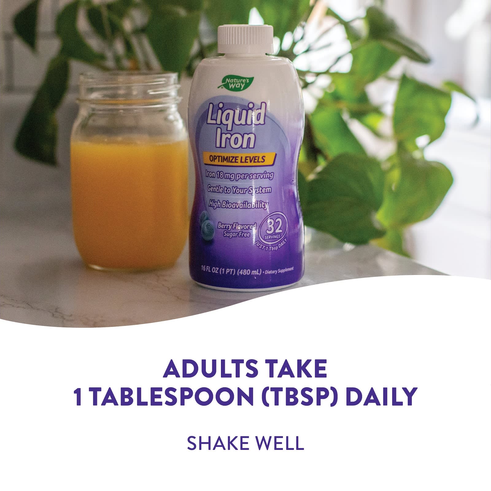 Agite antes de usar. Adultos devem tomar 1 colher de sopa (Tbsp) (1/2 onça fluida / 15 ml) diariamente, diretamente ou misturada com água ou suco. Não exceda a dose recomendada. Para otimizar a absorção de ferro, tome este produto pelo menos 2 horas antes ou depois de tomar cálcio ou laticínios.