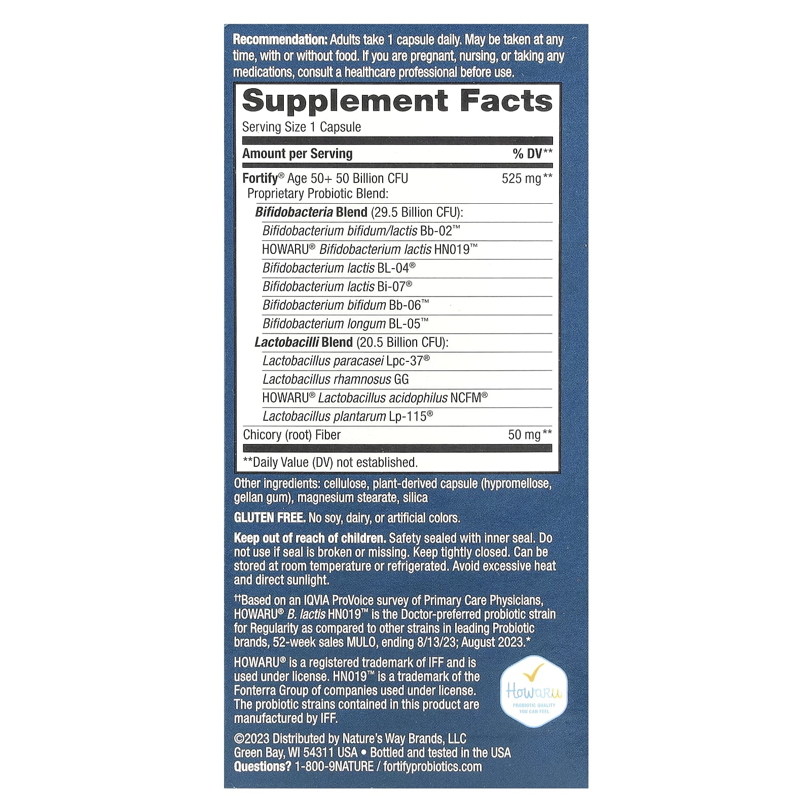 | Fortify® Age 50+ 50 Bilhões de UFCs Mistura Probiótica Patenteada: Mistura de Bifidobactérias (29,5 Bilhões de UFCs) Bifidobacterium bifidum/lactis Bb-02™ HOWARU® Bifidobacterium lactis HN019™ Bifidobacterium lactis BL-04® Bifidobacterium lactis Bi-07® Bifidobacterium bifidum Bb-06™ Bifidobacterium longum BL-05™ Mistura de Lactobacilos (20,5 Bilhões de UFCs): Lactobacillus paracasei Lpc-37® Lactobacillus rhamnosus GG HOWARU® Lactobacillus acidophilus NCFM® Lactobacillus plantarum Lp-115® |
