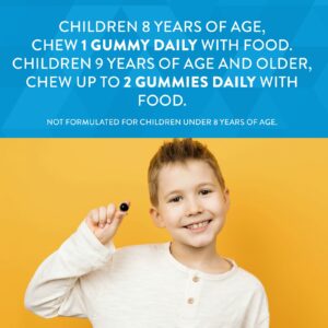 Não formulado para crianças menores de 8 anos de idade. Crianças de 8 anos de idade: mastigar 1 goma por dia com um alimento. Crianças a partir de 9 anos de idade: mastigar até 2 gomas por dia com um alimento. Oriente a criança a mastigar bem as gomas antes de engolir. Não exceda a dose recomendada.