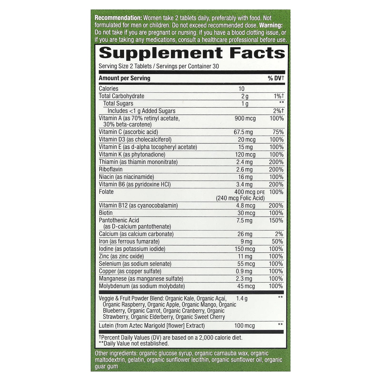 100% ou mais dos Valores Diários de 18 vitaminas e minerais por dose de 2 comprimidos.