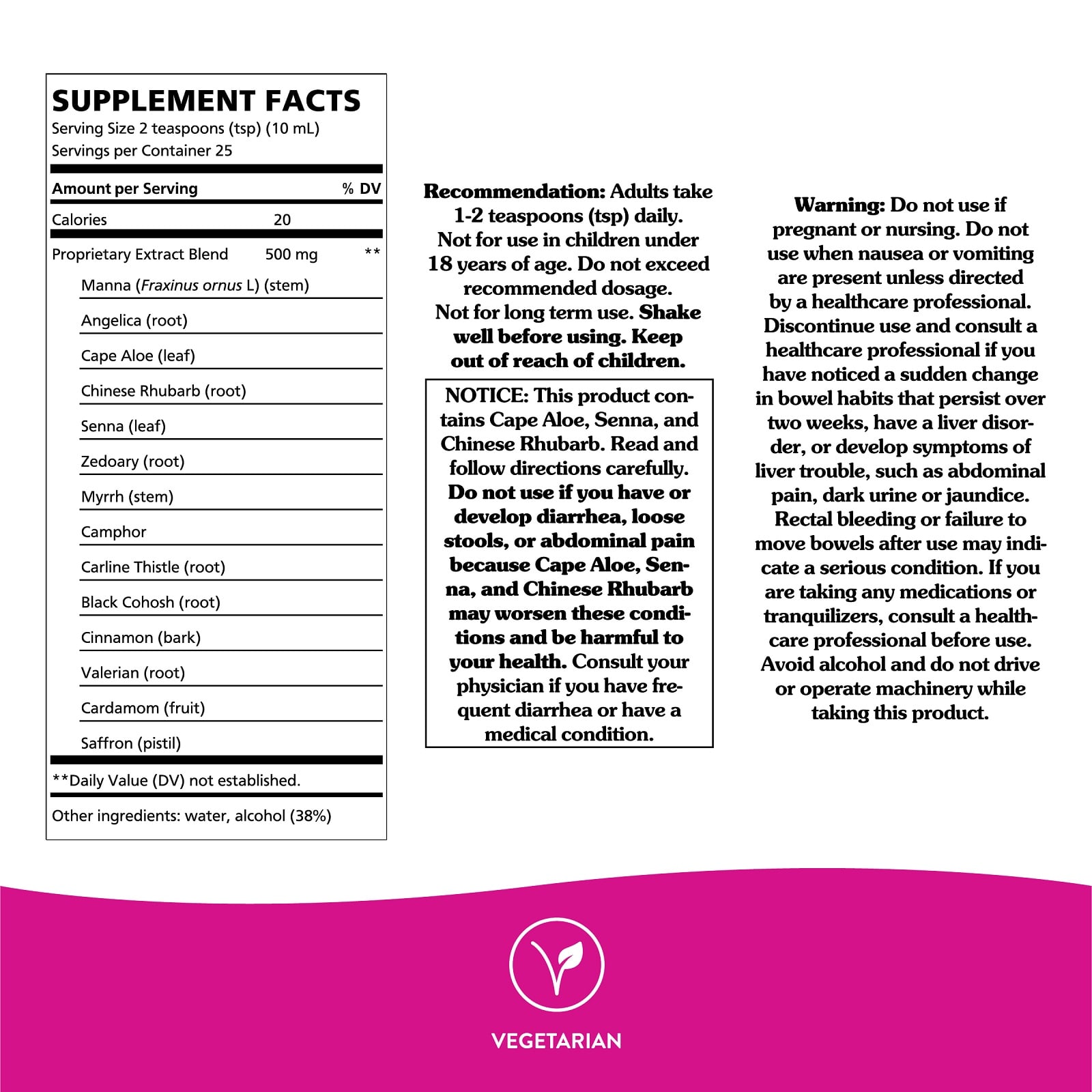 Aviso: Este produto contém Cape Aloe, Senna e Ruibarbo Chinês. Leia e siga as instruções cuidadosamente. Não use se você tiver ou desenvolver diarreia, fezes moles ou dor abdominal porque o Cabo de Aloe, o Senna e o Ruibarbo Chinês podem piorar essas condições e ser prejudiciais à sua saúde. Consulte seu médico se você tiver diarreia frequente ou tiver algum problema de saúde.