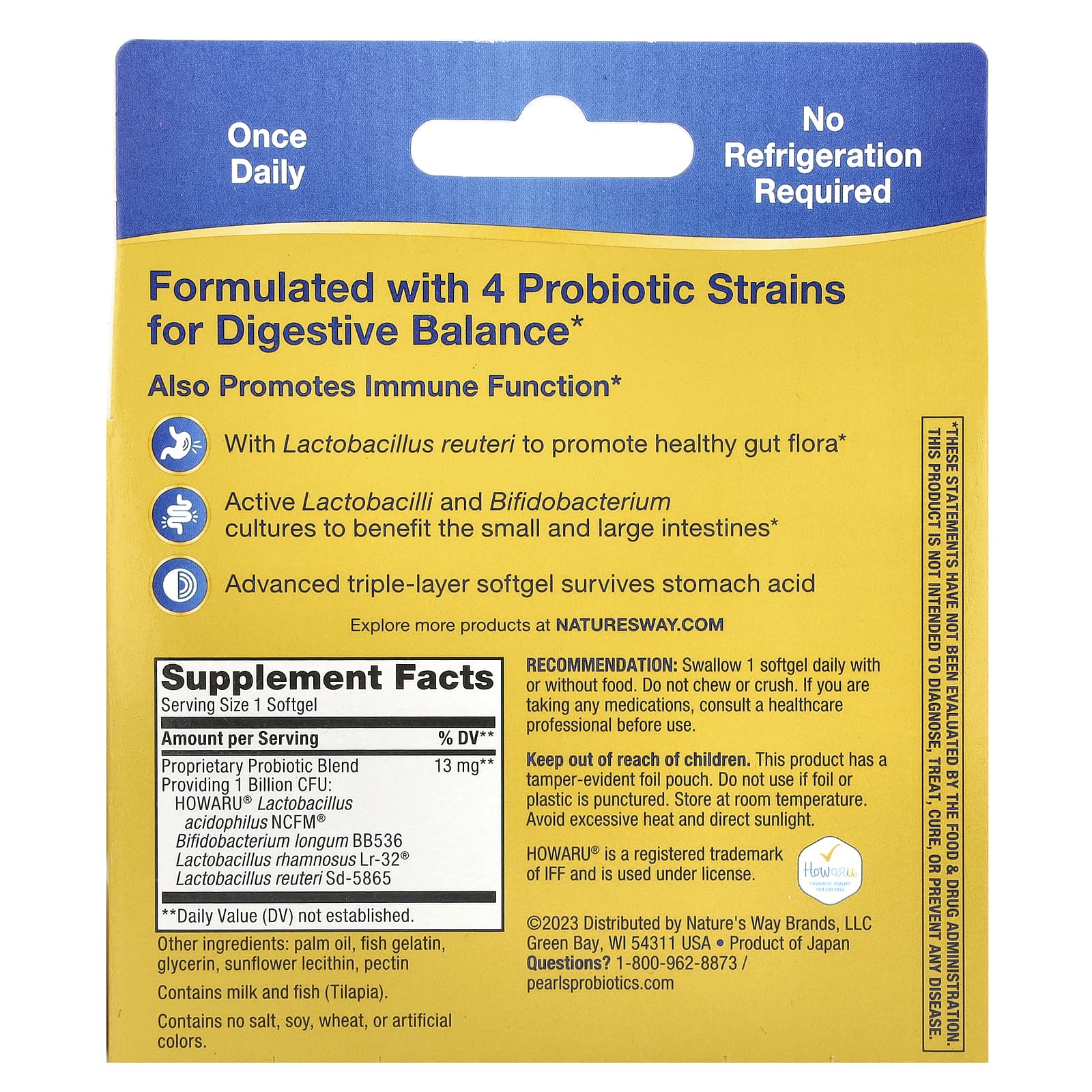 | Mistura Probiótica Patenteada fornecendo 1 Bilhão de UFCs: HOWARU® Lactobacillus acidophilus NCFM® Bifidobacterium longum BB536 Lactobacillus rhamnosus Lr-32® Lactobacillus reuteri SD-5865 |