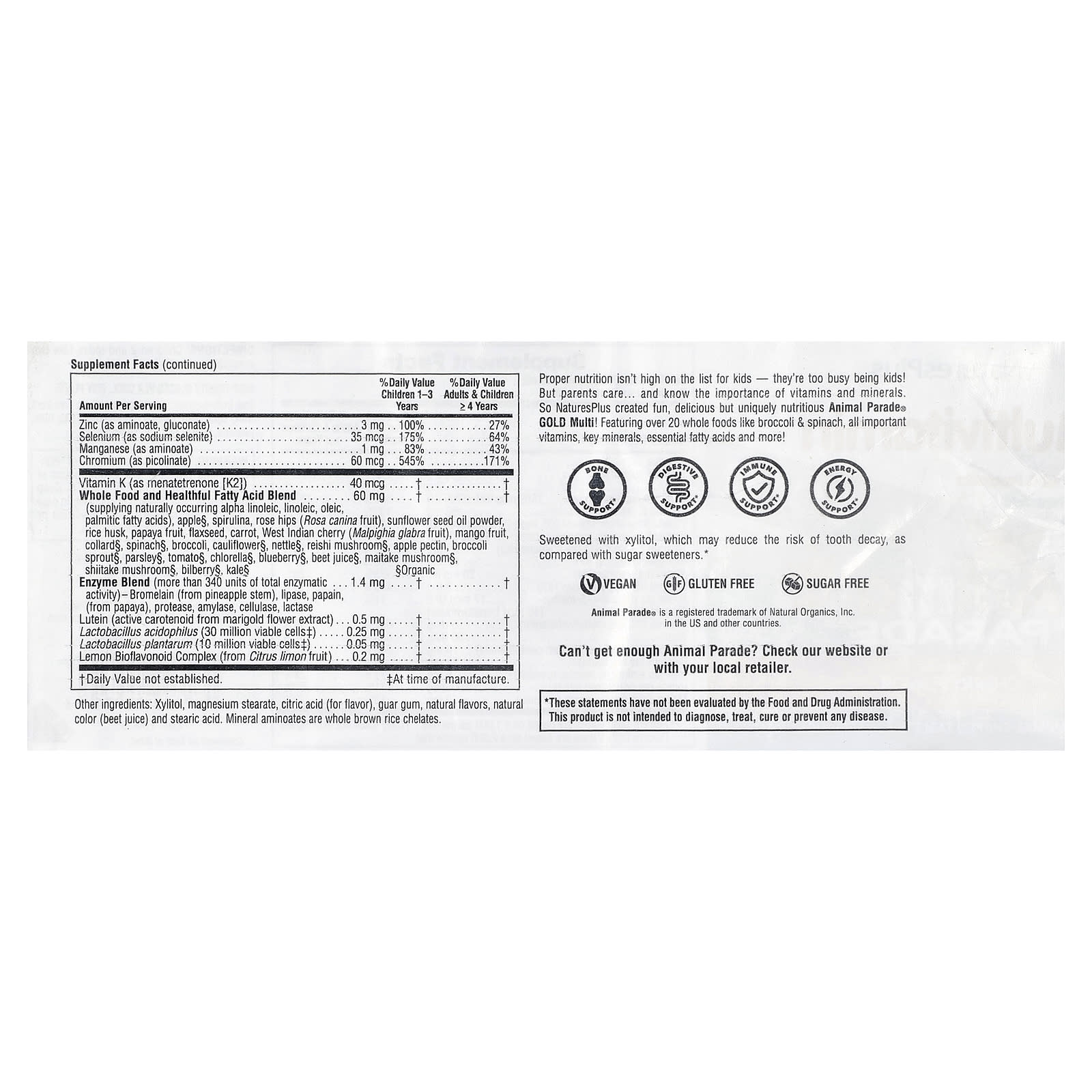 A nutrição adequada não é uma das principais preocupações das crianças; elas estão ocupadas demais sendo crianças!Mas os pais se preocupam com a alimentação de seus filhos… e sabem da importância das vitaminas e dos minerais.Assim, a NaturesPlus criou o Multivitamínico nutritivo e divertido Animal Parade® GOLD Multi!Ele contém mais de 20 alimentos integrais, como brócolis e espinafre, todas as vitaminas importantes, minerais e ácidos graxos essenciais e muito mais!
