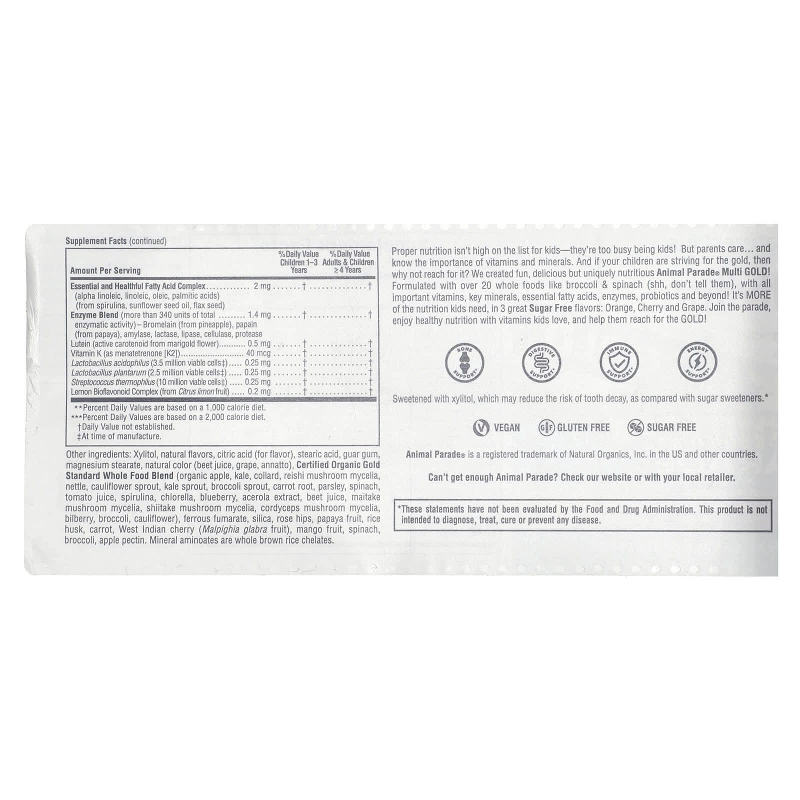 A nutrição adequada não é uma das principais preocupações das crianças; elas estão ocupadas demais sendo crianças! Mas os pais se preocupam com a alimentação de seus filhos… e sabem da importância das vitaminas e dos minerais. E se seus filhos estão tentando alcançar o primeiro lugar, por que não fazer isso? Nós criamos o Multivitamínico nutritivo e divertido Animal Parade® GOLD! Formulado com mais de 20 alimentos integrais, como brócolis e espinafre (xiu, não conte para eles), com todas as vitaminas importantes, minerais e ácidos graxos essenciais, enzimas, probióticos e muito mais! É MAIS dos nutrientes que as crianças precisam, em 3 ótimos sabores Sem Açúcar: Laranja, Cereja e Uva. Junte-se ao desfile, desfrute de uma nutrição saudável com vitaminas que as crianças adoram e ajude-as a alcançar o OURO!