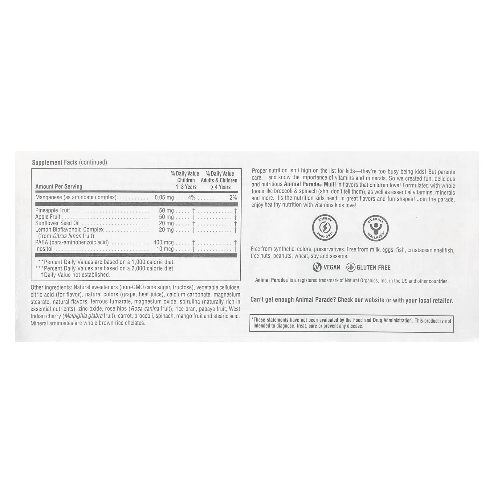 A nutrição adequada não é uma das principais preocupações das crianças; elas estão ocupadas demais sendo crianças! Mas os pais se preocupam com a alimentação de seus filhos… e sabem da importância das vitaminas e dos minerais. Por isso, criamos o Multivitamínico Animal Parade® divertido, delicioso, nutritivo e com sabores que as crianças adoram. Formulado com alimentos integrais, como brócolis e espinafre (psiu, não conte isso para as crianças), bem como vitaminas e minerais essenciais e muito mais. É a nutrição de que as crianças precisam, em ótimos sabores e formas divertidas. Junte-se a essa festa e aproveite uma nutrição saudável com as vitaminas que as crianças adoram!