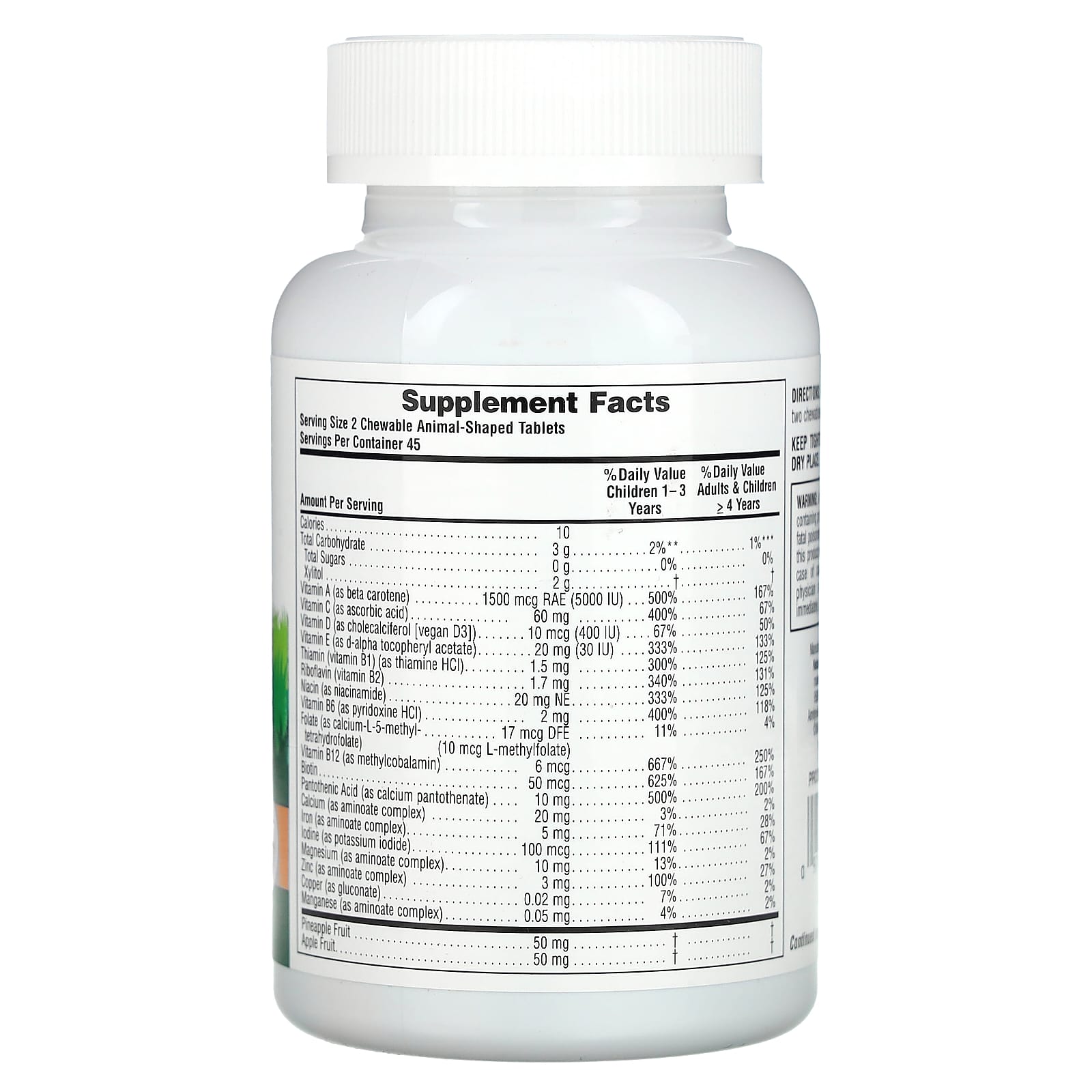 Xilitol, cereja natural, framboesa, sabores de laranja e uva; corante natural (suco de beterraba, urucum, curcumina, uva), celulose vegetal, ácido cítrico, carbonato de cálcio, goma de guar, estearato de magnésio, óxido de magnésio, ácido esteárico, fumarato ferroso, espirulina (naturalmente rica em nutrientes essenciais), óxido de zinco, citrato de potássio, Cinórrodo (fruta de Rosa canina), arroz integral, mamão papaia, iodeto de potássio, cereja das Índias ocidentais (fruta Malpighia glabra), cenoura, manga, brócolis, espinafre, mistura de fontes de nutrientes orgânicos (cogumelo orelha-de-pau [auricularia auricula], Cordysim ™ [bionectria ochroleuca], maitake [grifola frondosa], shiitake [lentinula edodes], cogumelo ostra [pleurotus ostreatus, pág. nebrodensis, pág. eryngii], juba de leão [Hericium erinaceus], amla [emblica officinalis] baga, goiaba, manjericão sagrado [ocimum tenuiflorum], limão). Aminoatos minerais são quelatos de arroz integral.