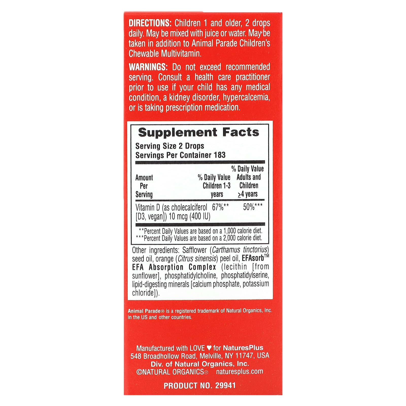 NaturesPlus Animal Parade Vitamina D3 em Gotas Laranja Natural 10 mcg (400 UI) 10 ml (034 fl oz) – Nature’s Plus Bebês e Crianças Saúde Infantil Vitaminas para Crianças Vitamina D para Crianças.