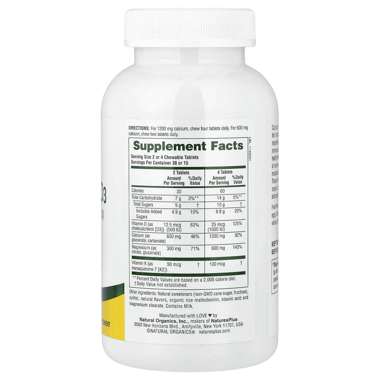 Com sabor de baunilha delicioso e satisfatório, NaturesPlus Cal / Mag / Vit D3 com Vitamina K2 Mastigável fornece uma combinação potente de cálcio e magnésio, sobrecarregada com 1000 UI de vitamina D3 e 100 mcg de vitamina K2 (menaquinona-7), para o máximo em suporte ósseo.