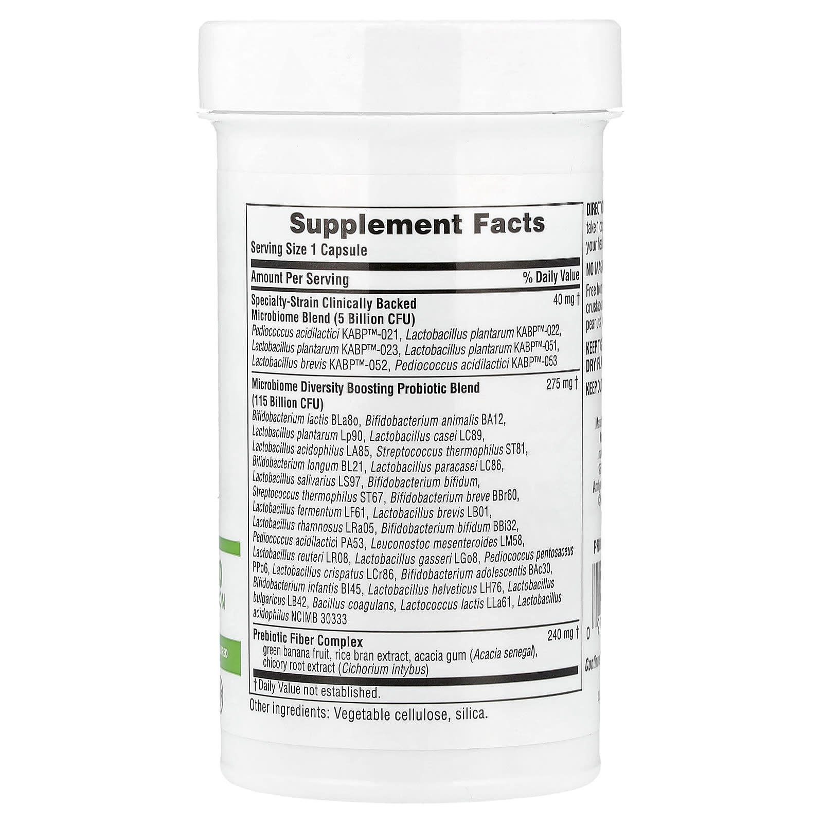 | Mistura de Probióticos para Aumento da Diversidade da Microbiota (115 Bilhões de UFC) L. acidophilus (LA85), L. plantarum, L. reuteri, B. longum, B. lactis, L. casei, L. salivarius, L. brevis, B. bifidum, B. animalis, L. mesenteroides, S. thermophiles, P. acidilactici, L. fermentum, L. rhamnosus, L. gasseri, L. paracasei, B. breve. Lactococcus lactis, L. bulgaricus, L. helveticus, L. crispatus, B. adolescentis, B. infantis, Pediococcus pentosaceus, L. acidophilus, S. thermophilus ST1447, Bifidobacterium bifidum ST1722, Bacillus coagulans |