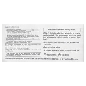 Cápsulas Softgel HEMA-PLEX® para quem prefere uma cápsula softgel fácil de engolir. Obtenha ferro de alta potência, organicamente ligado e com nutrientes essenciais necessários para a saúde ideal do sangue.