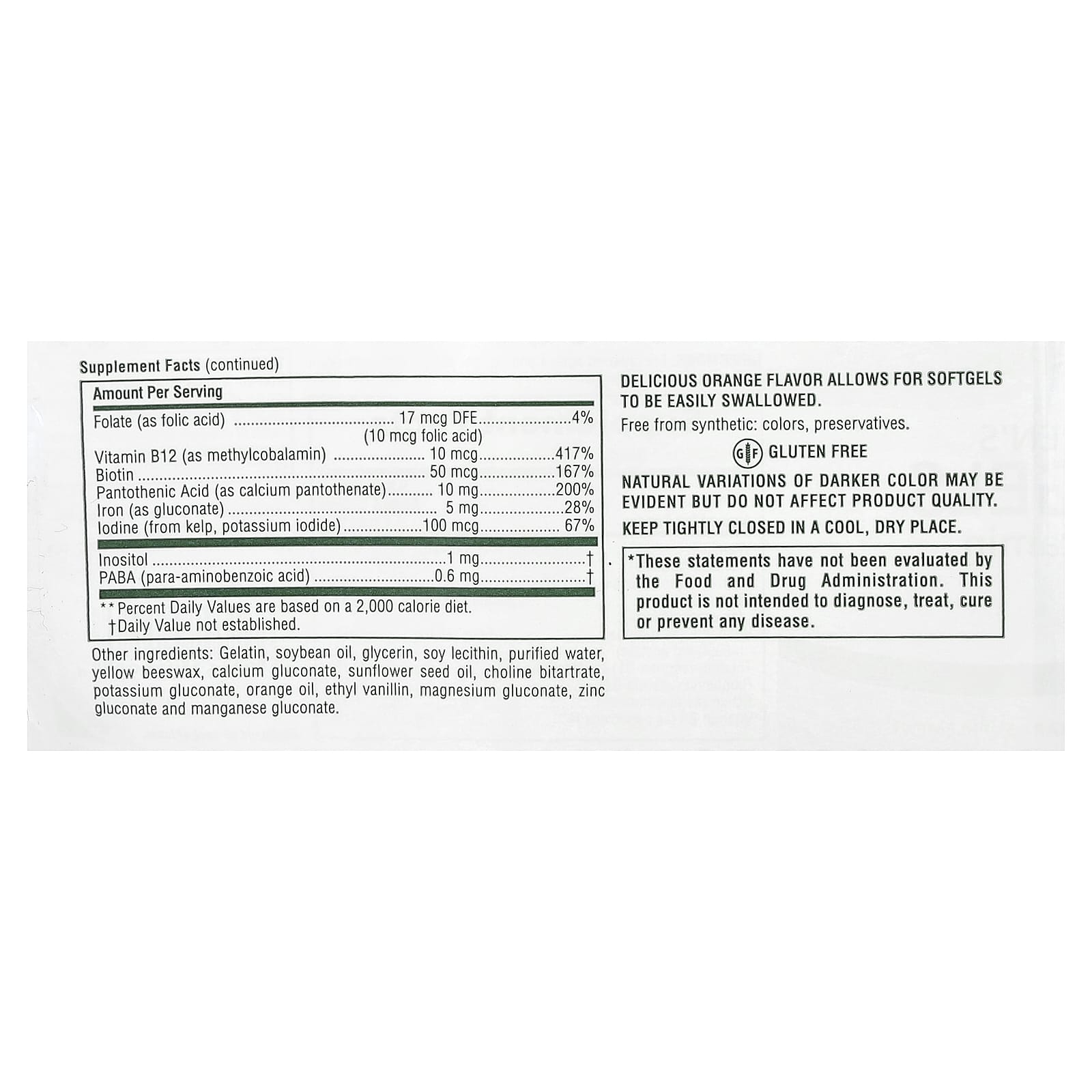 Gelatina, óleo de soja, glicerina, lecitina de soja, água purificada, cera de abelha amarela, gliconato de cálcio, óleo da semente de girassol, hemitartarato de colina, gliconato de potássio, óleo de laranja, etilvanilina, gliconato de magnésio, gliconato de zinco e gliconato de manganês.