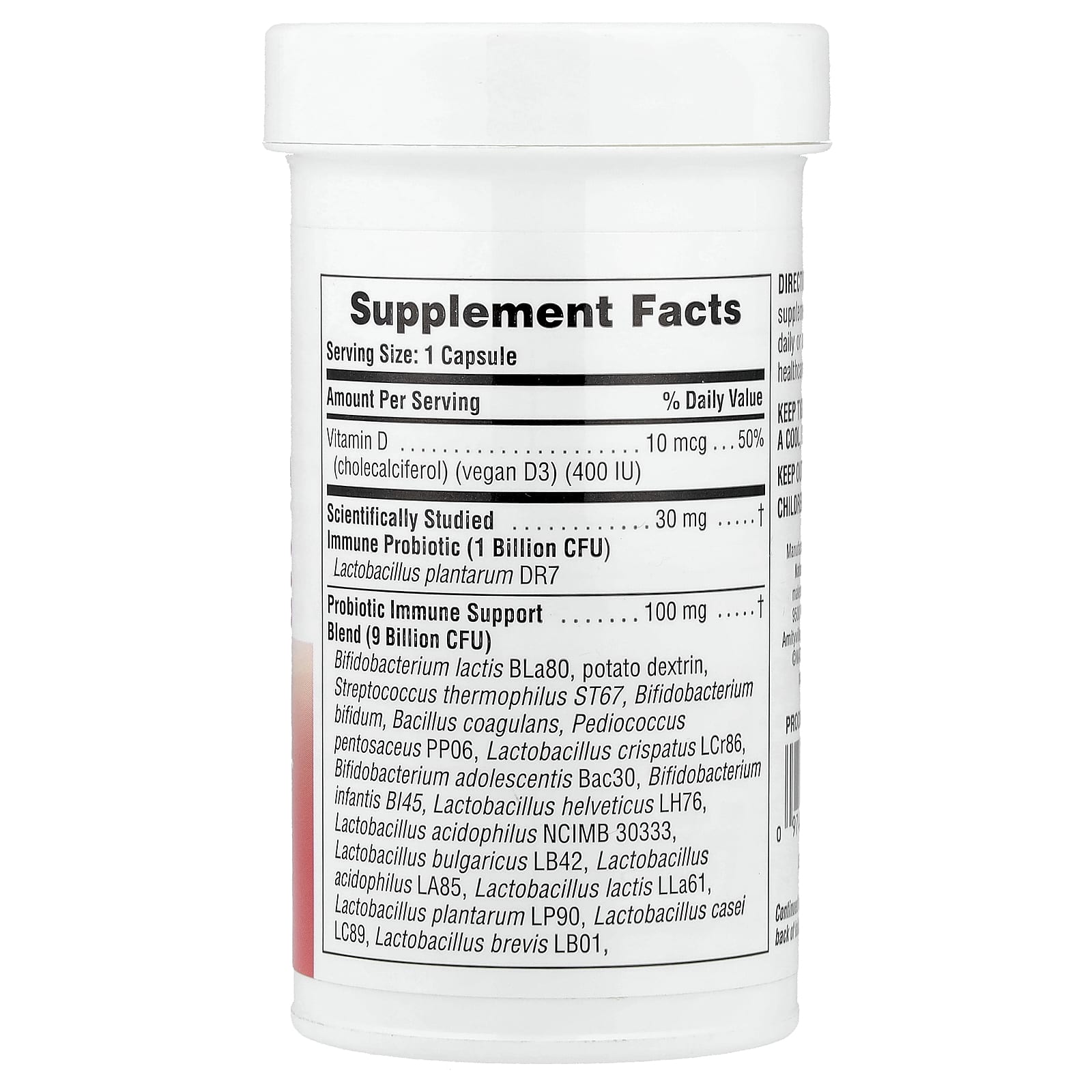 Cada cápsula não perecível e com potência total fornece 10 bilhões de bactérias probióticas vivas de suporte imunológico de 19 estirpes, incluindo a estirpe DR7 cientificamente comprovada de Lactobacillus plantarum, que demonstrou promover a saúde imunológica, a saúde respiratória e a saúde do trato gastrointestinal.