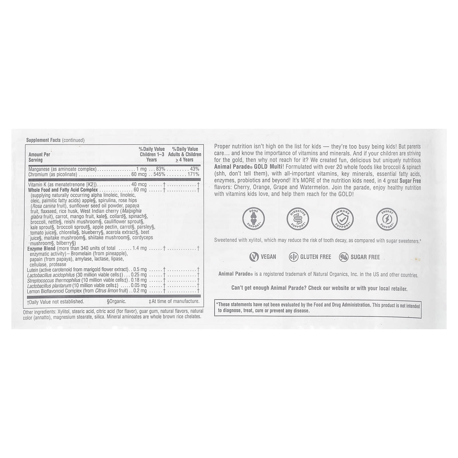 A nutrição adequada não é uma das principais preocupações das crianças; elas estão ocupadas demais sendo crianças! Mas os pais se preocupam com a alimentação de seus filhos… e sabem da importância das vitaminas e dos minerais. E se seus filhos se esforçam para serem os melhores, por que não ajudá-los? Criamos o Multivitamínico Animal Parade® GOLD divertido e nutritivo! Formulado com mais de 20 alimentos integrais como brócolis e espinafre (psiu, não diga a eles), com todas as vitaminas importantes, os principais minerais, ácidos graxos essenciais, enzimas, probióticos e muito mais. É MAIS da nutrição de que as crianças precisam, em 4 excelentes sabores Sem Açúcar: Cereja, Laranja, Uva e Melancia. Junte-se a essa festa, aproveite uma nutrição saudável com as vitaminas que eles adoram e ajude seus filhos a serem os melhores!