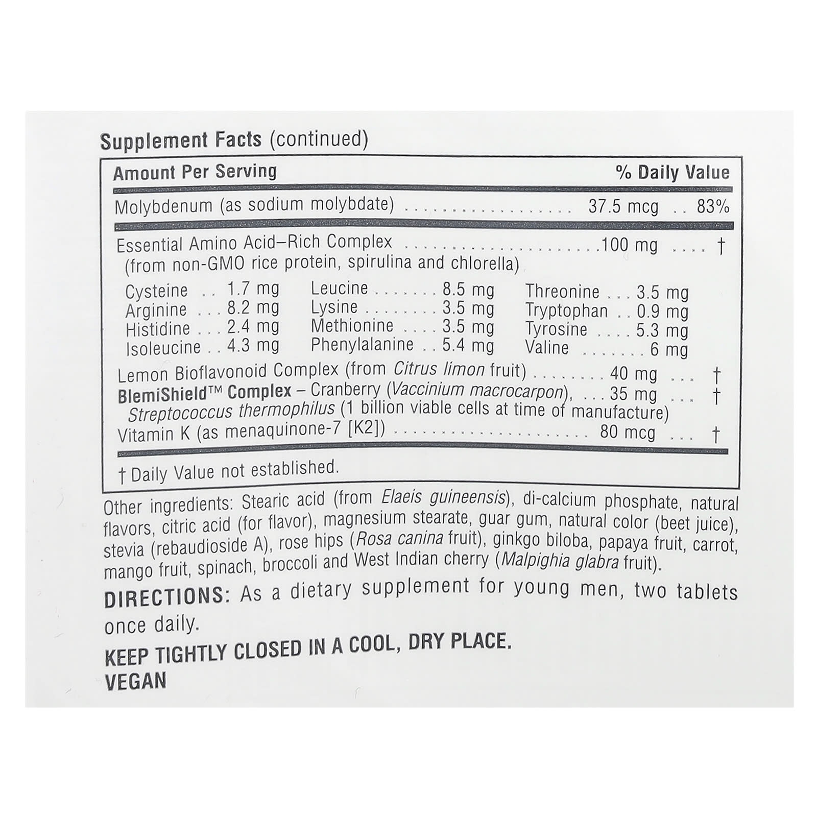 | Complexo BlemiShield™ – Cranberry (Vaccinium macrocarpon), Streptococcus thermophilus (1 bilhão de células viáveis no momento da fabricação) |