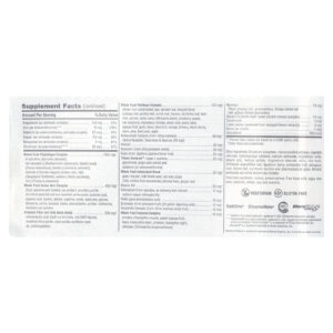 | Complexo de Alimentos Integrais para o Bem-Estar Concentrados de frutas inteiras: ervilha, folha de espinafre, flor de brócolis, folha de repolho, folha de salsa, raiz de cenoura, banana, folha de dente-de-leão, damasco, camu-camu (Myrciaria dubia), cranberry, pêssego, framboesa vermelha, morango, tomate, beterraba, verduras, bulbo de cebola, semente de aipo, mamão, dente de alho, azeitona, laranja, mirtilo europeu, cereja preta, ameixa, pera, beterraba, extrato de semente de uva, maçã. Complexo de bioflavonoides (de Citrus spp.) (flavonóis, flavanonas e flavonas ativas [26 mg]) |