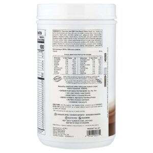 Mistura patenteada de proteínas à base de plantas não OGM (soja [proteína de soja isolada e soja fermentada], proteína de ervilha e proteína de arroz), frutose, cacau holandês, fosfato de cálcio dibásico, oligofrutose, goma xantana não OGM, citrato de potássio, celulose microcristalina, óxido de magnésio, sabores naturais, ácido ascórbico, goma guar, espirulina, acetato de dextroalfatocoferol, hemitartarato de colina, inositol, nicotinamida, vitamina A (palmitato), pectina de maçã, óxido de zinco, psyllium, biotina, pantotenato de cálcio, fumarato ferroso, colecalciferol vegano, sulfato de manganês, lecitina, bioflavonoides de limão, cloridrato de piridoxina, riboflavina, clorofilina, mamão, cloridrato de tiamina, cálcio-l-5-levomefolato, iodeto de potássio, bromelaína, cloreto de cromo, molibdato de sódio, selenito de sódio, mecobalamina… e amor.