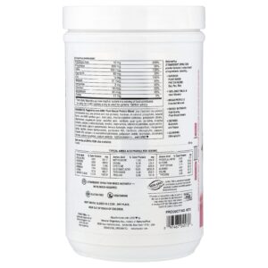 Mistura patenteada de proteínas à base de plantas não OGM (soja [proteína de soja isolada e soja fermentada], proteína de ervilha e proteína de arroz), frutose, fosfato de cálcio dibásico, sabores naturais, goma xantana não OGM, suco de beterraba, celulose microcristalina, citrato de potássio, oligofrutose, óxido de magnésio, ácido ascórbico, psyllium, goma guar, espirulina, acetato de dextroalfatocoferol, hemitartarato de colina, inositol, nicotinamida, vitamina A (palmitato), pectina de maçã, óxido de zinco, biotina, pantotenato de cálcio, fumarato ferroso, colecalciferol vegano, sulfato de manganês, lecitina, bioflavonoides de limão, cloridrato de piridoxina, riboflavina, clorofilina, mamão, cloridrato de tiamina, cálcio-l-5-levomefolato, iodeto de potássio, bromelaína, cloreto de cromo, molibdato de sódio, selenito de sódio, mecobalamina … e amor.