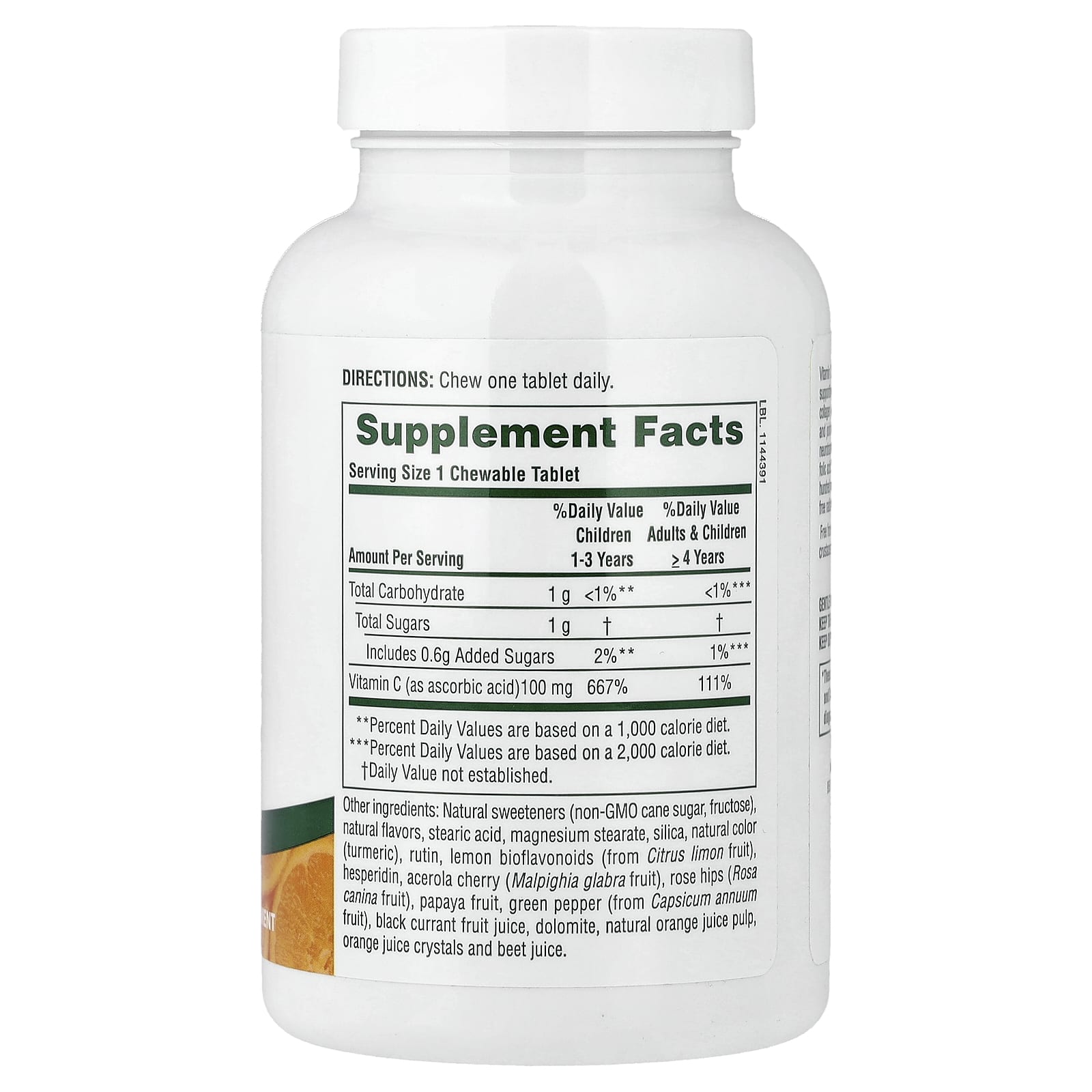 | Vitamina C (como ácido ascórbico) | 100 mg | 667% | 111% |