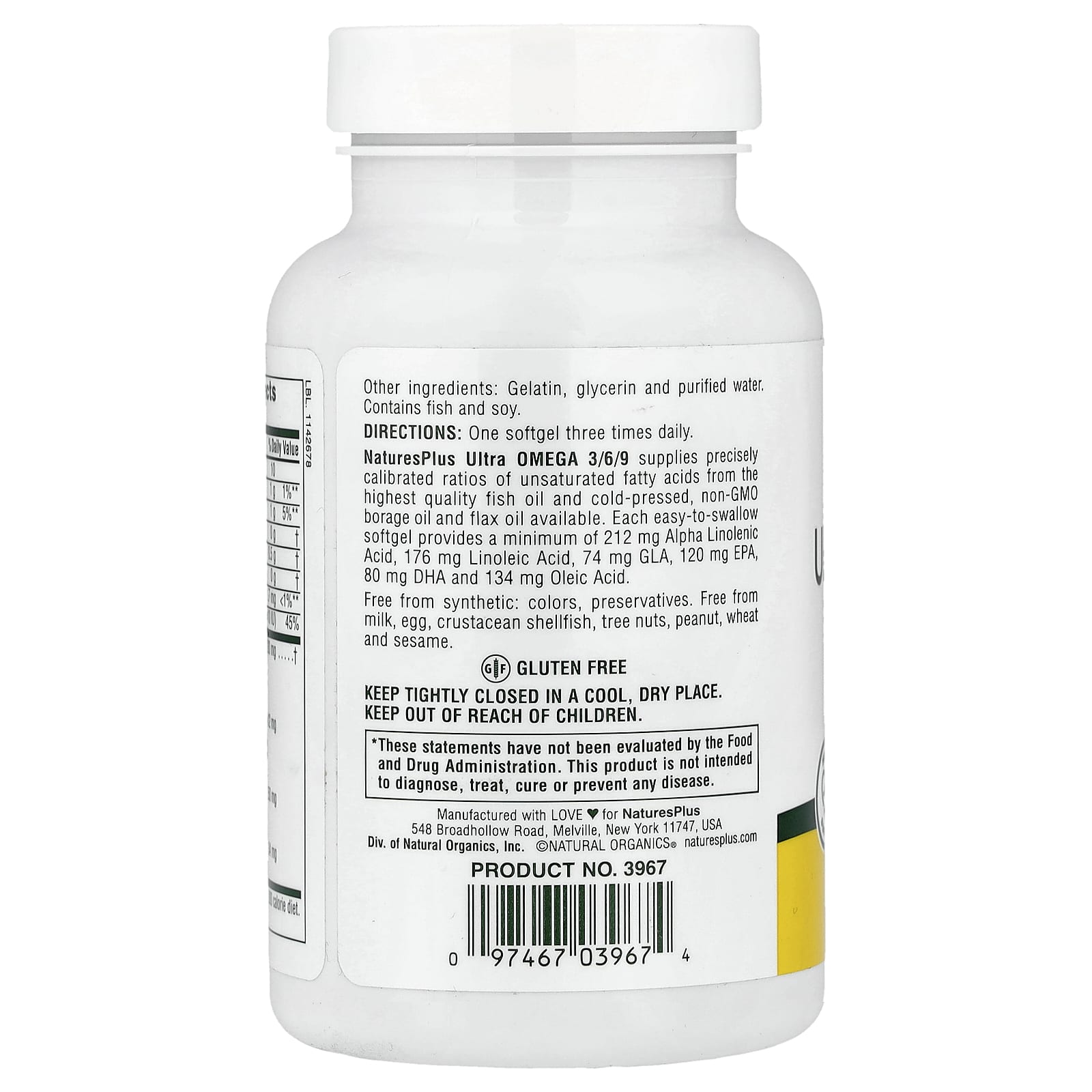 O Ultra Ômega 3/6/9 da NaturesPlus fornece proporções calibradas com precisão de ácidos graxos insaturados do óleo de peixe da mais alta qualidade e óleo de borragem não OGM e óleo de linhaça prensados a frio disponíveis. Cada cápsula softgel fácil de engolir fornece no mínimo 212 mg de Ácido Alfa-Linolênico, 176 mg de Ácido Linoleico, 74 mg de GLA, 120 mg de EPA, 80 mg de DHA e 134 mg de Ácido Oleico.