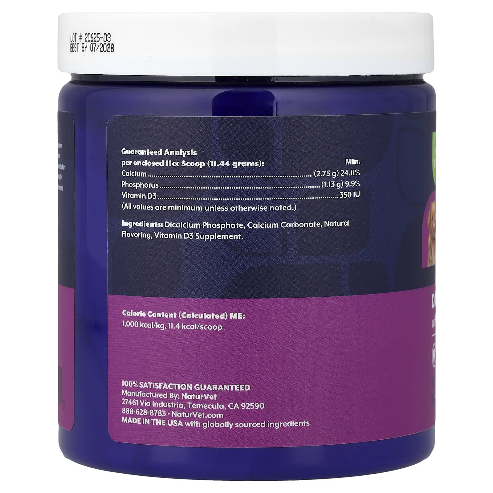 Fosfato de cálcio dibásico, carbonato de cálcio, sabor natural, suplemento de vitamina D3.