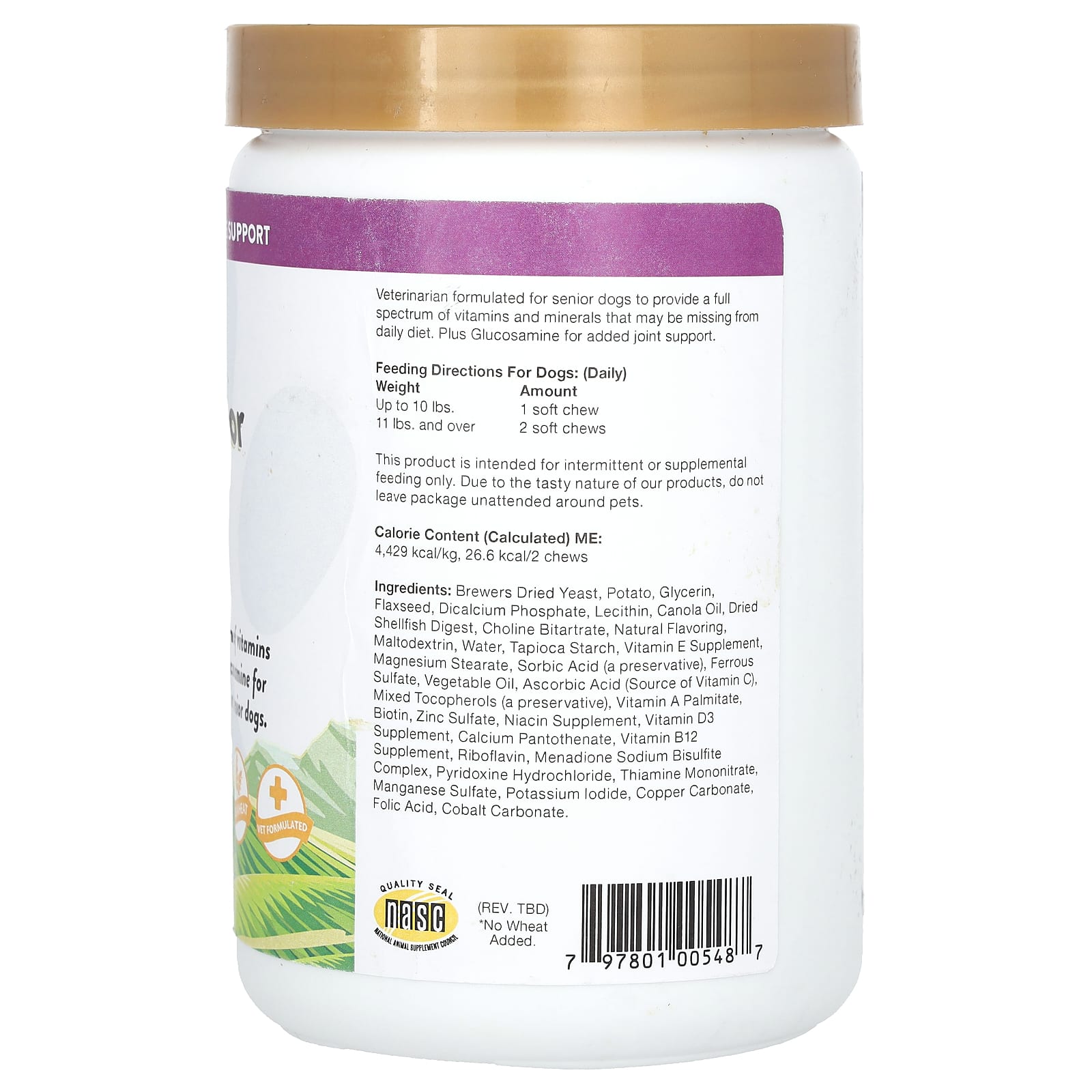 Formulado especificamente para cães idosos. Fornece um espectro completo de vitaminas e minerais com glucosamina para suporte adicional às articulações.