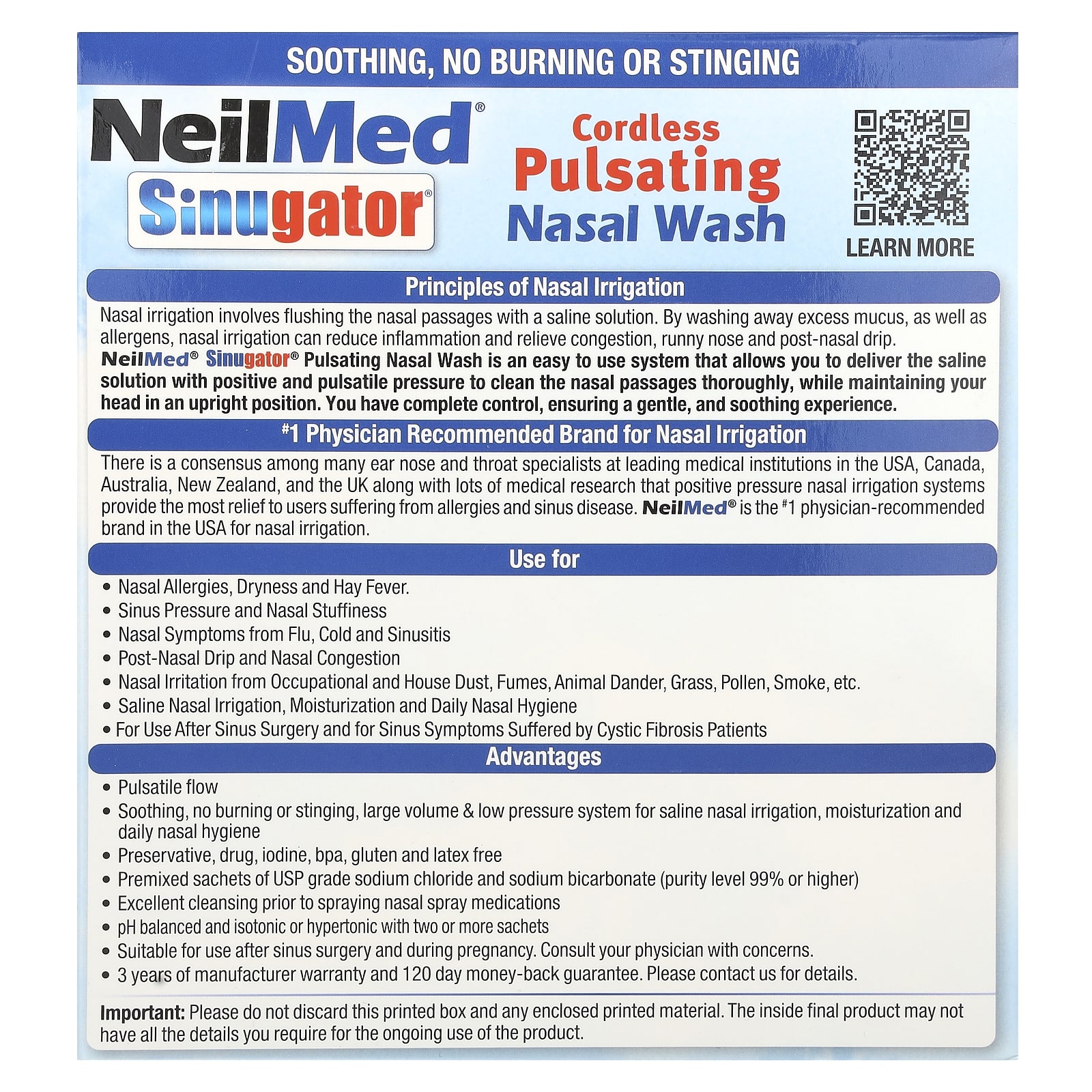 - Adequado para uso após cirurgia sinusal e durante a gravidez. Consulte seu médico se tiver dúvidas.