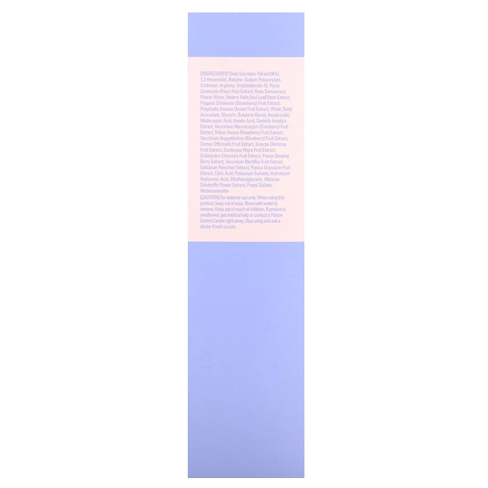 Filtrado de secreção de caracol (96%), 1,2-hexanediol, betaína, sodium polyacrylate, carbômero, arginina, octildodeceto-16, extrato da fruta Pyrus communis (pera), água da flor de Rosa damascena, extrato da folha / caule de hedera helix (ivy), extrato da fruta de Fragaria chiloensis (morango), extrato da fruta de pimpinella anisum (anis), água, avocadato de butilo, glicerina, butilenoglicol, asiaticosídeo, madecassic acid, asiatic acid, extrato de Centella asiatica, extrato da fruta de Vaccinium macrocarpon (cranberry), extrato da fruta de Rubus idaeus (framboesa), extrato da fruta de Vaccinium angustifolium (mirtilo), extrato da fruta de Cornus officinalis, extrato do fruto de Euterpe oleracea, extrato da fruta de Sambucus nigra, extrato da fruta de Schizandra chinensis, extrato da baga de Panax ginseng, extrato da fruta de Vaccinium myrtillus, extrato de Epilobium fleischeri, extrato da fruta de Punica granatum, ácido cítrico, sorbato de potássio, ácido hialurônico hidrolisado, ethylhexylglycerin, extrato da flor de Hibiscus sabdariffa, galato de propila, madecassosídeo.