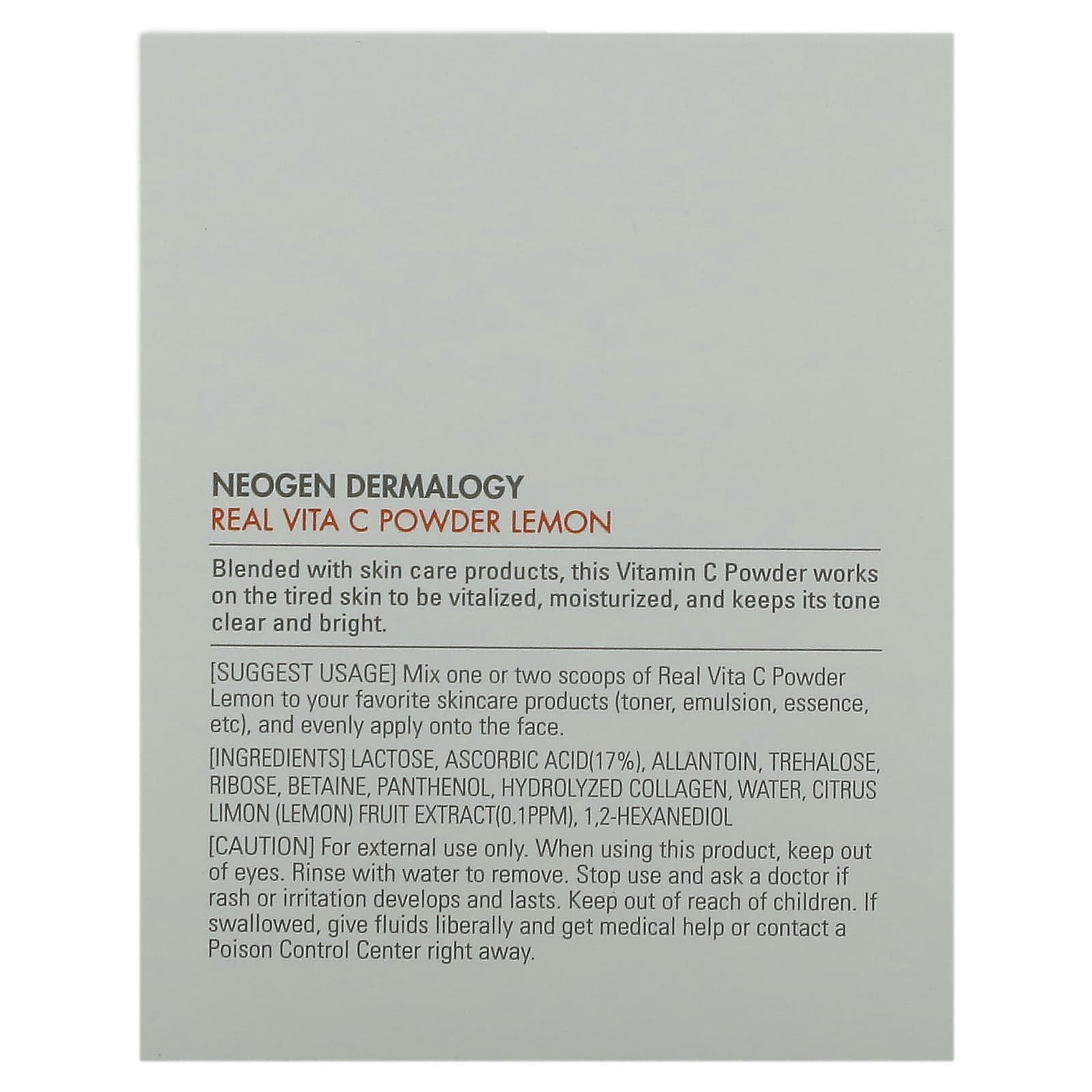 Lactose, ácido ascórbico (17%), alantoína, trealose, ribose, betaína, pantenol, colágeno hidrolisado, água, extrato da fruta cítrica limon (limão) (0,1 ppm), 1,2-hexanediol.