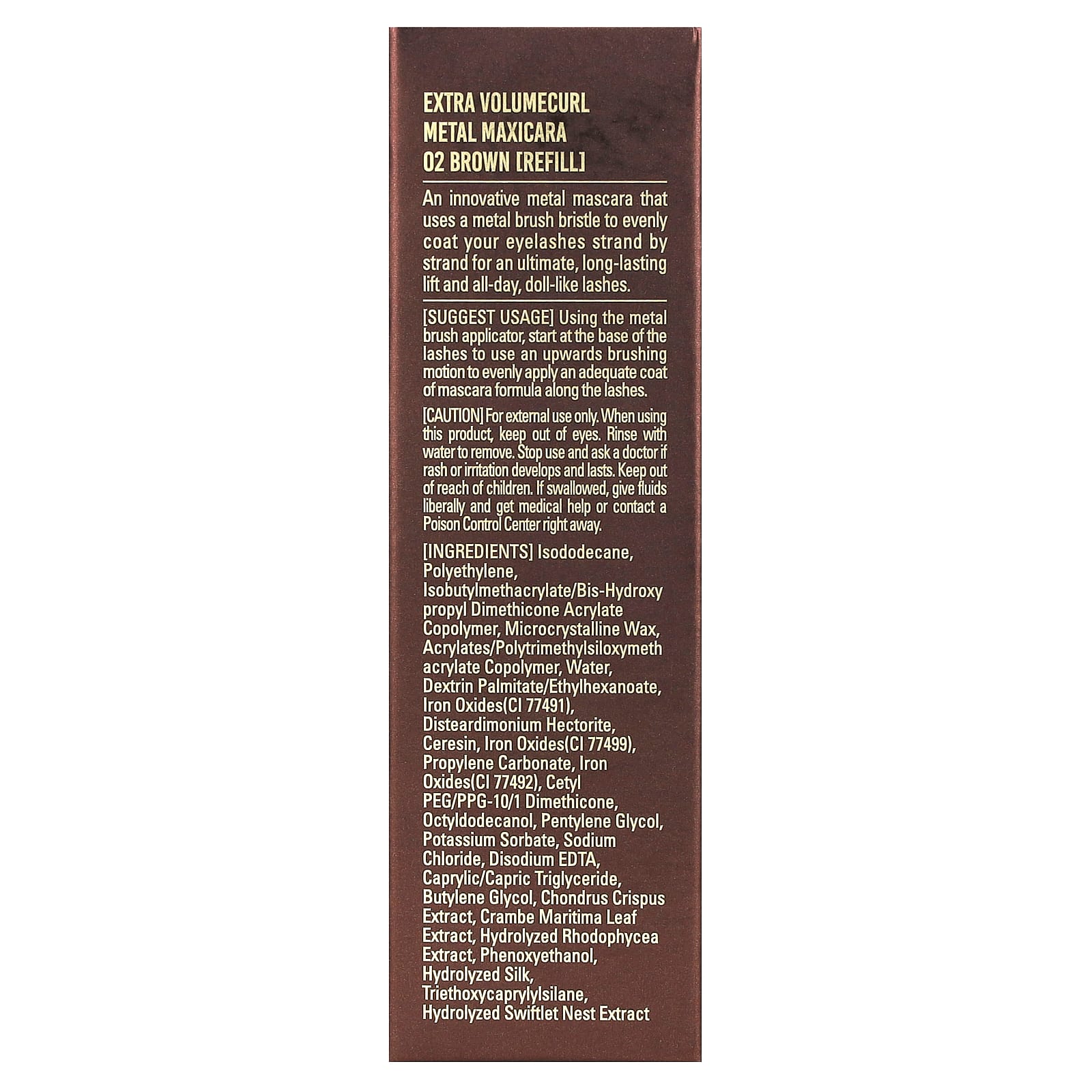 Uma máscara de cílios de metal inovadora que usa uma cerda de escova de metal para revestir uniformemente as mechas de seus cílios, proporcionando um lifting definitivo e duradouro, além de cílios como os de uma Boneca que dura o dia todo.
