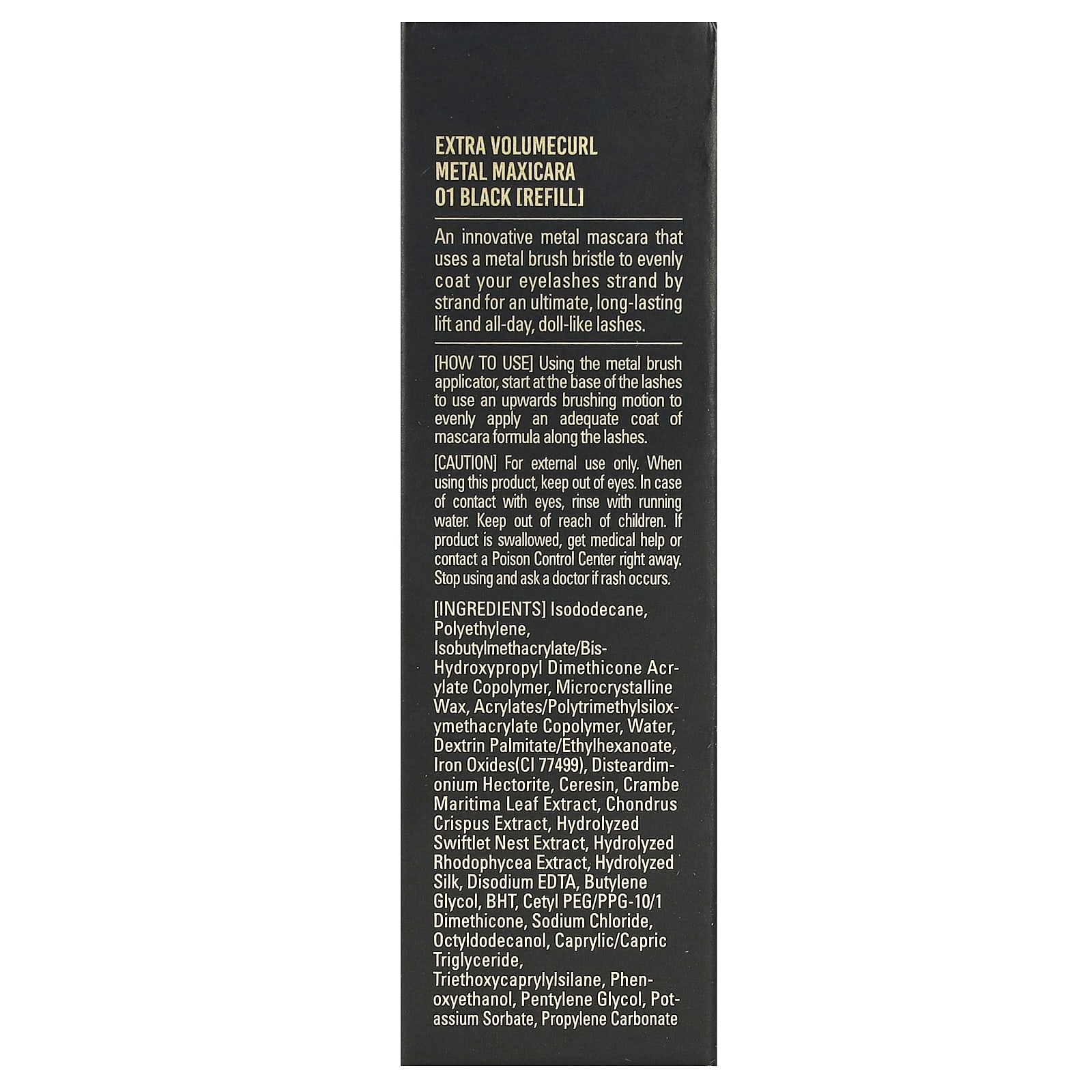 Uma máscara de cílios de metal inovadora que usa uma cerda de escova de metal para revestir uniformemente as mechas de seus cílios, proporcionando um lifting definitivo e duradouro, além de cílios como os de uma Boneca que dura o dia todo.