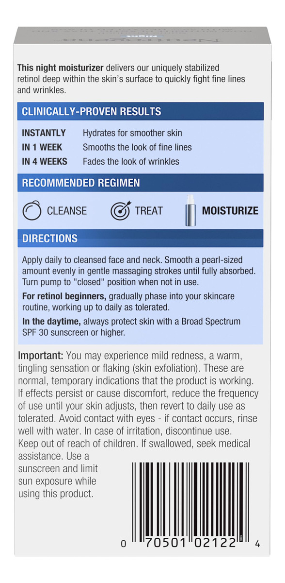 Descrição do produto Ajude a hidratar sua pele, reduzindo o visual de rugas e manchas escuras com neutrogena Rapid Wrinkle Repair Retinol Anti-Wrinkle Night Cream. Nossa fórmula antirrugas clinicamente comprovada, este hidratante de retinol de ação rápida e pescoço melhora visivelmente o visual de rugas teimosas, incluindo pés de corvo e rugas na testa e bochecha. Também ajuda a reduzir o visual de linhas finas e textura, e ilumina e iguala o tom de pele. Em um ensaio clínico, 100% das mulheres experimentaram resultados perceptíveis em apenas uma semana. A fórmula do hidratante contém retinol comprovado pelo dermatologista, um ingrediente poderoso que combate linhas finas, embotamento, rugas e manchas escuras. O creme noturno também contém ácido hialurônico para adicionar umidade de plumping para ajudar a hidratar e rejuvenescer o visual da pele. Este hidratante retinol está livre de parabenos, óleo mineral e corantes e vem da marca de retinol número 1 mais utilizada pelos dermatologistas. História da marca por neutrogena