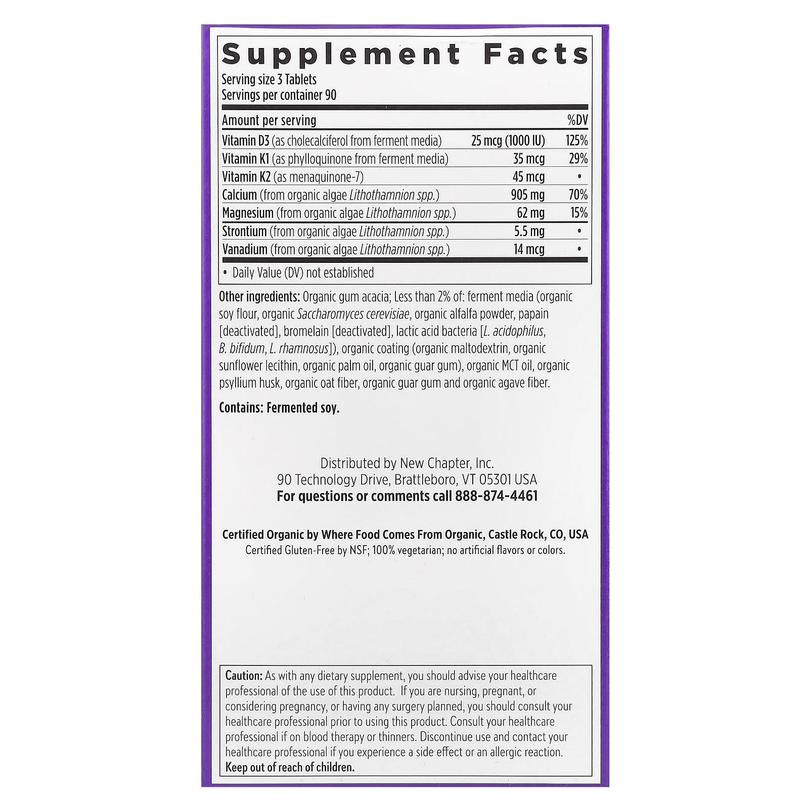 Goma de acácia orgânica; Menos de 2% de: meio de fermentação (farinha de soja orgânica, Saccharomyces cerevisiae orgânico, pó de alfafa orgânica, papaína [desativada], bromelina [desativada], bactérias do ácido láctico [L. acidophilus, B. bifidum, L. rhamnosus]), revestimento orgânico (maltodextrina orgânica, lecitina de girassol orgânico, óleo de palma orgânica, goma guar orgânica), óleo TCM orgânico, casca de psílio orgânico, fibra de aveia orgânica, goma guar orgânica e fibra de agave orgânico.