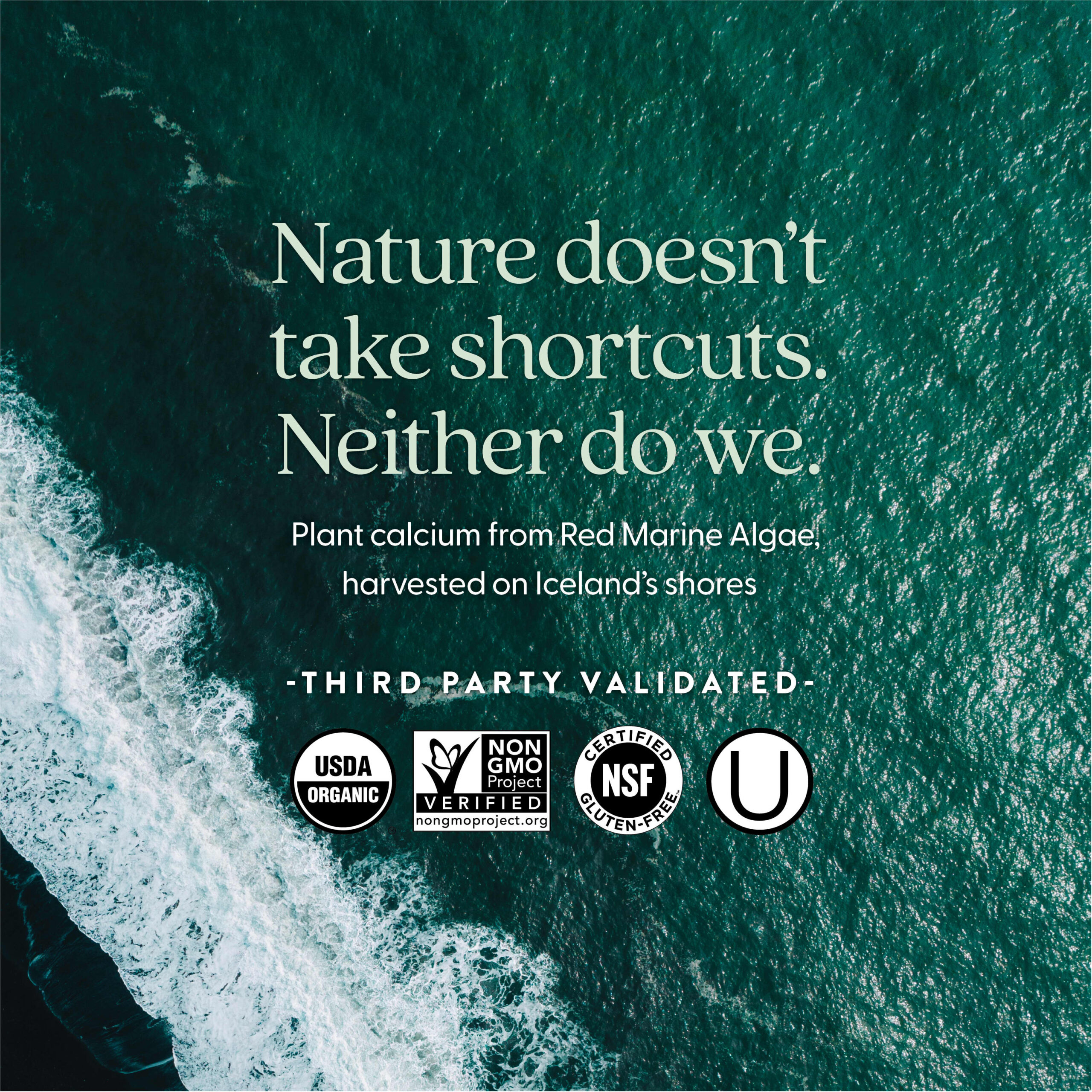 Ao contrário do cálcio da rocha calcária, que não tem outros nutrientes para reforçar os ossos, nosso cálcio vegetal orgânico é de Algas Marinhas Vermelhas selvagens (Lithothamnion), uma fonte de alimentos integrais com mais de 70 minerais para nutrição óssea holística. Ele é colhido de forma sustentável na costa da Islândia.