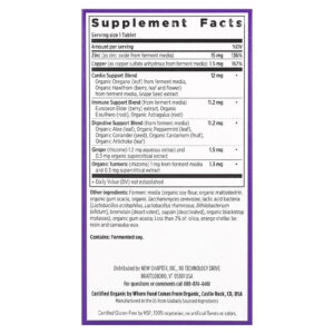Meios de fermentação (farinha de soja orgânica, maltodextrina orgânica, goma de acácia orgânica, Saccharomyces cerevisiae orgânico, bactérias do ácido láctico [Lactobacillus acidophilus, Lactobacillus rhamnosus, Bifidobacterium bifidum], bromelina [desativada], papaína [desativada], melaço-de-são-joão orgânico), goma de acácia orgânica; Menos de 2% de: dióxido de silício, resina de laca de laranja e cera de carnaúba.