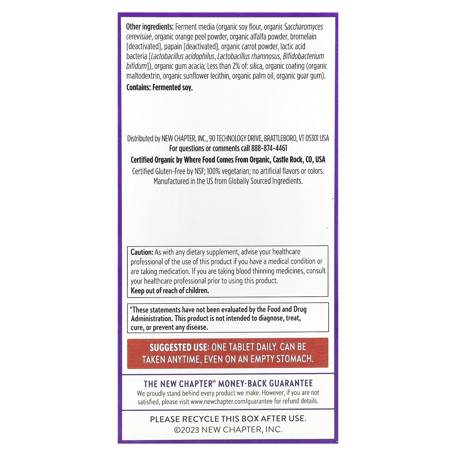 Meios de fermentação (farinha de soja orgânica, Saccharomyces cerevisiae orgânico, pó da casca de laranja orgânica, pó de alfafa orgânica, bromelina [desativada], papaína [desativada], pó de cenoura orgânica, bactérias do ácido láctico [Lactobacillus acidophilus, Lactobacillus rhamnosus, Bifidobacterium bifidum]), goma de acácia orgânica; menos de 2% de: sílica, revestimento orgânico (maltodextrina orgânica, lecitina de girassol orgânico, óleo de palma orgânica, goma guar orgânica).