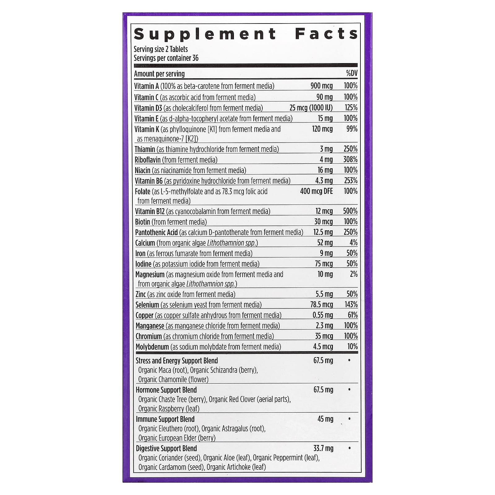 Auxílio completo para a saúde geral das mulheres e benefícios específicos do sistema, com nutrientes para coração, cérebro, visão, saúde óssea e das mamas, alívio do estresse e digestão saudável, embalados em apenas 2 comprimidos por dia.