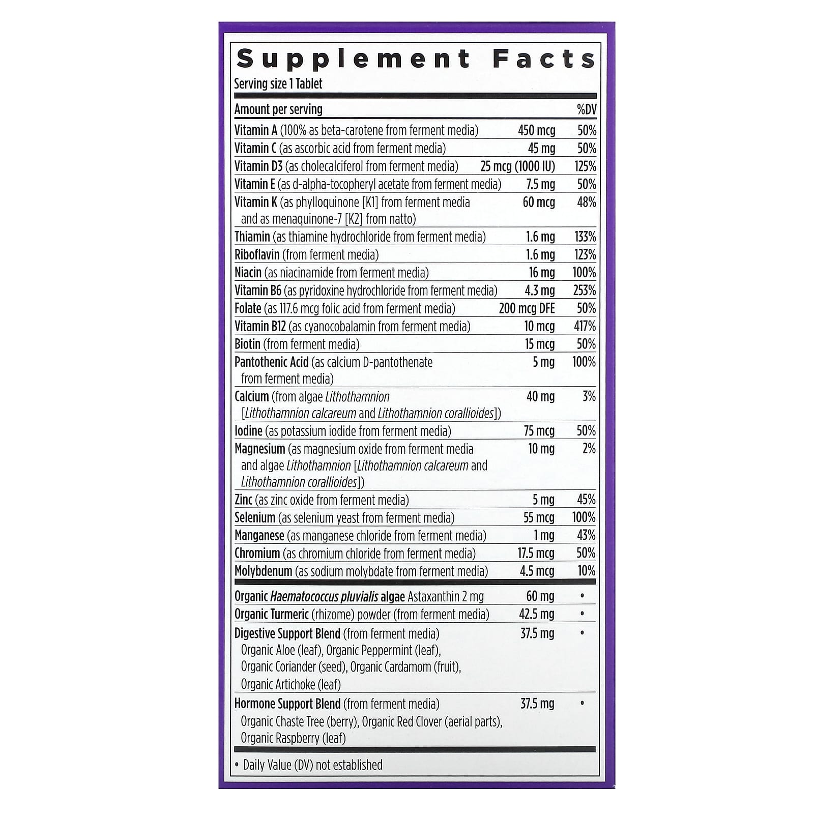 | Vitamina K (como filoquinona [K1] de meio de fermentação e como menaquinona-7 [K2] de natto) | 60 mcg | 48% |