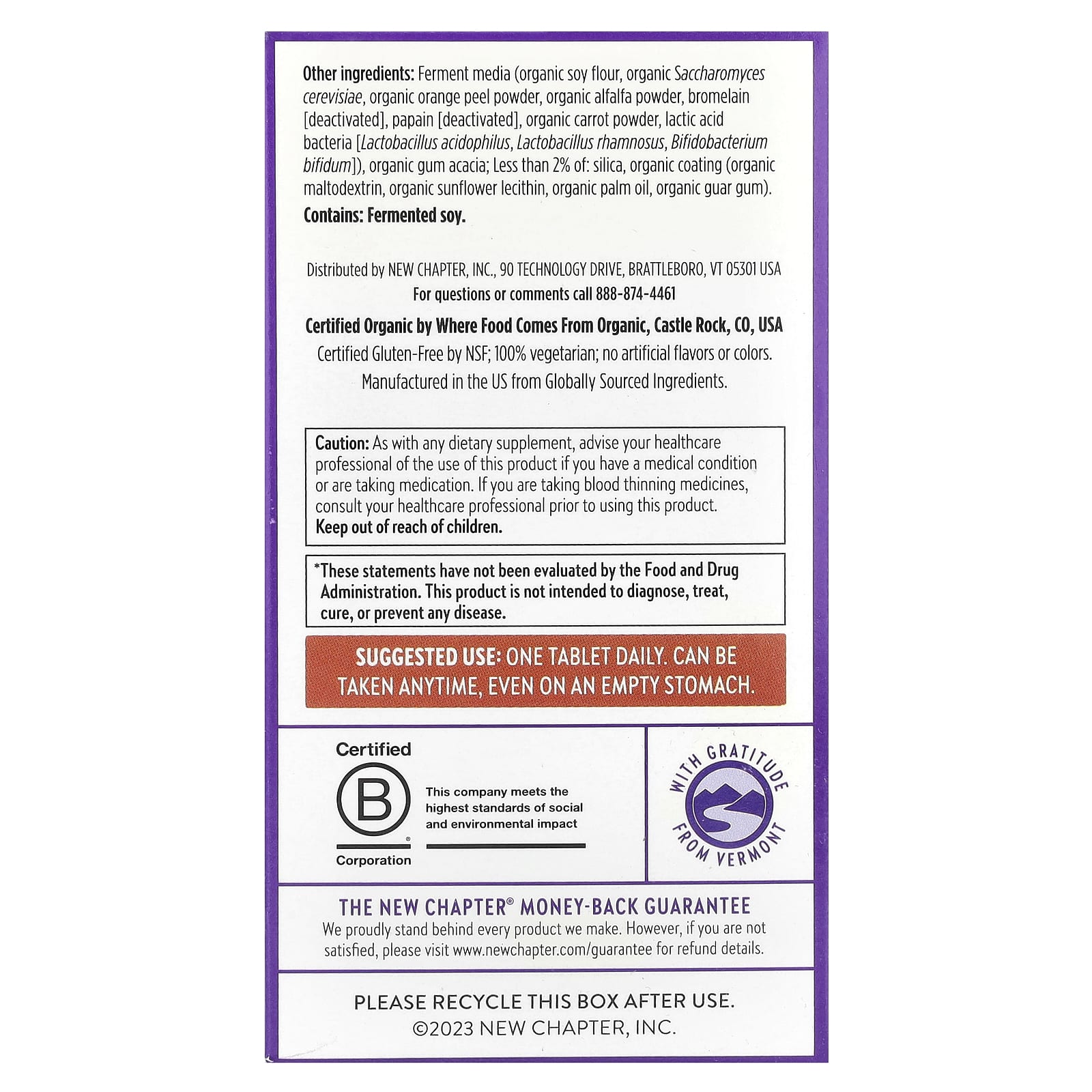 Meios de fermentação (farinha de soja orgânica, Saccharomyces cerevisiae orgânico, pó da casca de laranja orgânica, pó de alfafa orgânica, bromelina [desativada], papaína [desativada], pó de cenoura orgânica, bactérias do ácido láctico [Lactobacillus acidophilus, Lactobacillus rhamnosus, Bifidobacterium bifidum]), goma de acácia orgânica; Menos de 2% de: dióxido de silício, revestimento orgânico (maltodextrina orgânica, lecitina de girassol orgânico, óleo de palma orgânica, goma guar orgânica).