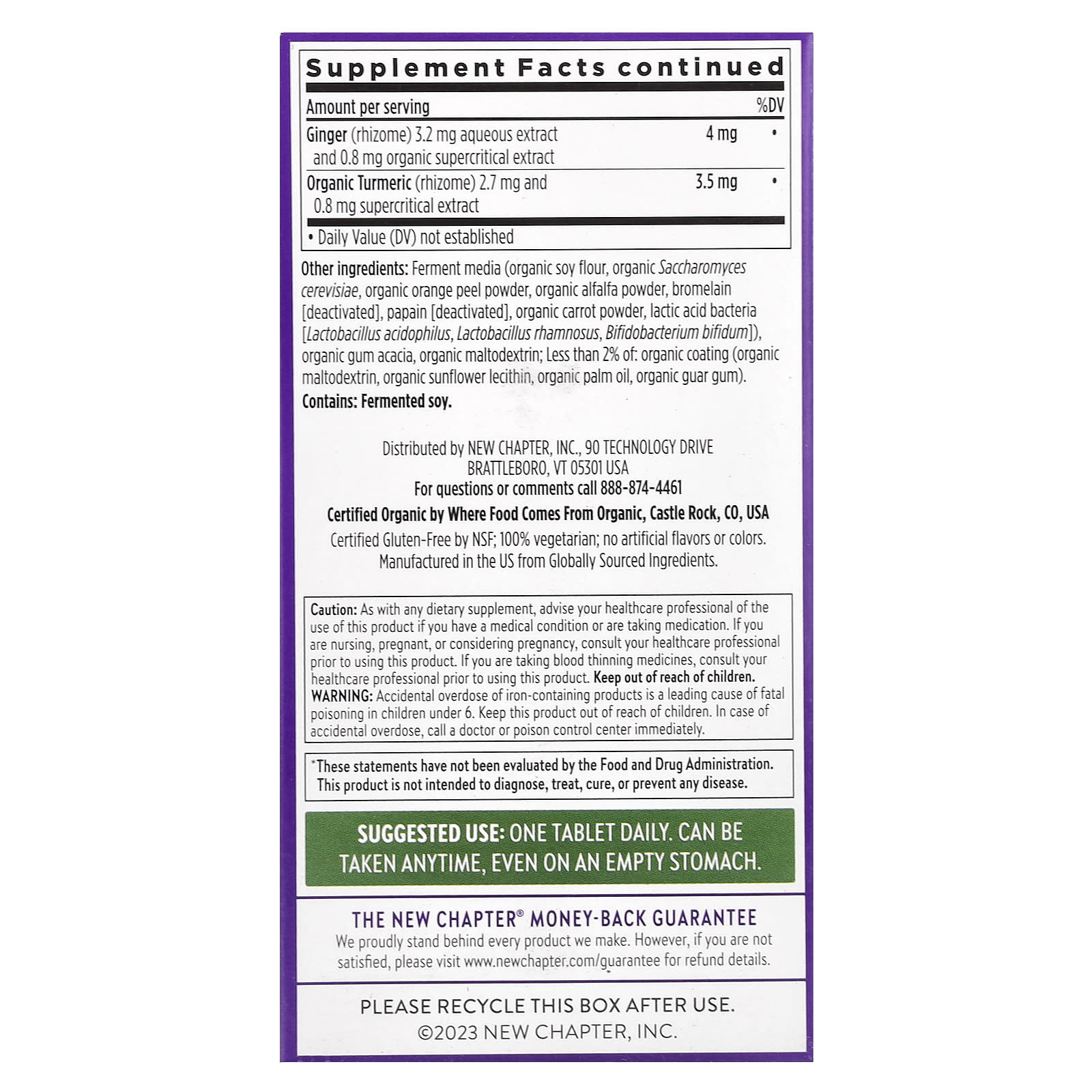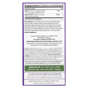 Meios de fermentação (farinha de soja orgânica, Saccharomyces cerevisiae orgânico, pó da casca de laranja orgânica, pó de alfafa orgânica, bromelina [desativada], papaína [desativada], pó de cenoura orgânica, bactérias do ácido láctico [Lactobacillus acidophilus, Lactobacillus rhamnosus, Bifidobacterium bifidum]), goma de acácia orgânica, maltodextrina orgânica; Menos de 2% de: revestimento orgânico (maltodextrina orgânica, lecitina de girassol orgânico, óleo de palma orgânica, goma guar orgânica).