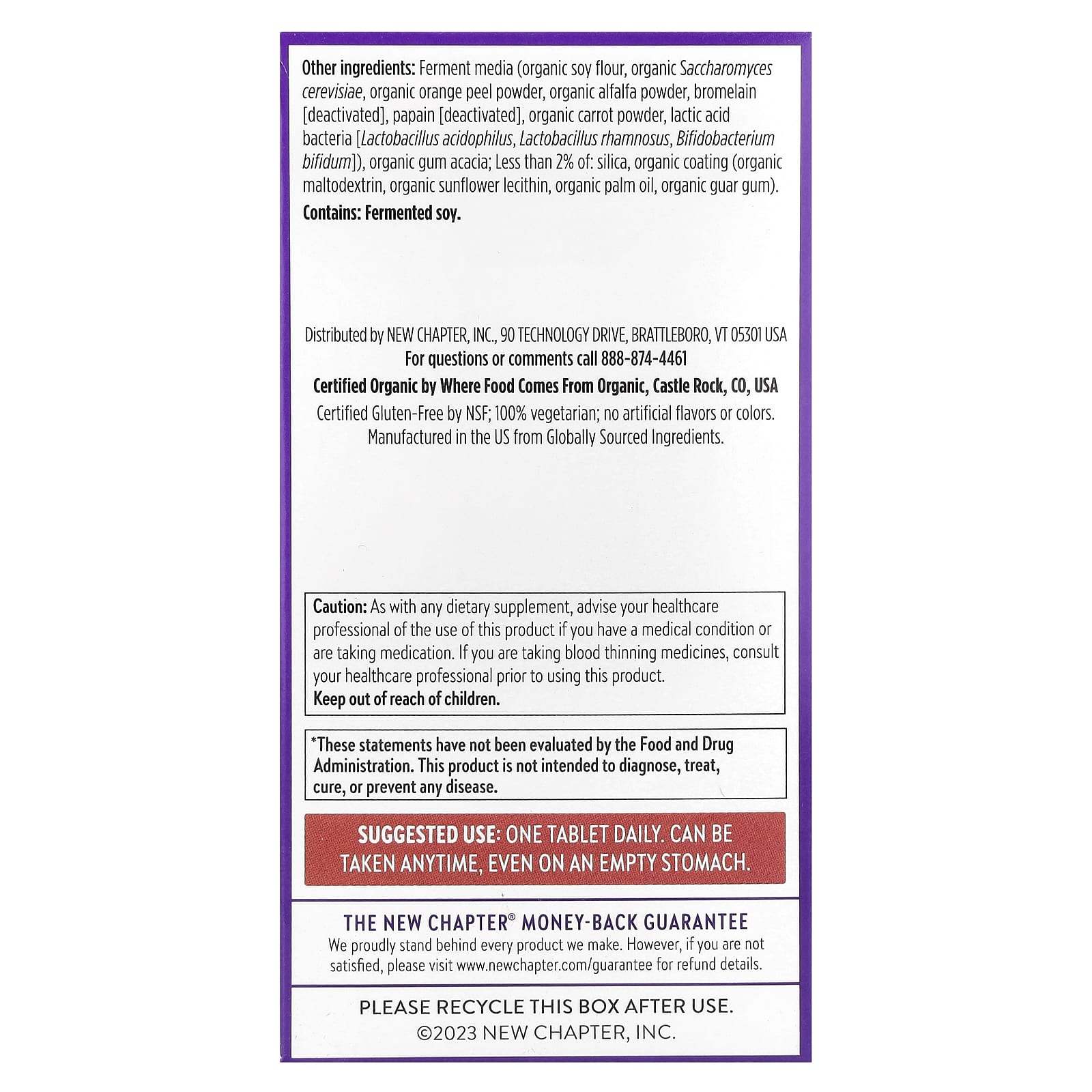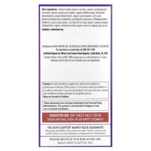 Meios de fermentação (farinha de soja orgânica, Saccharomyces cerevisiae orgânico, pó da casca de laranja orgânica, pó de alfafa orgânica, bromelina [desativada], papaína [desativada], pó de cenoura orgânica, bactérias do ácido láctico [Lactobacillus acidophilus, Lactobacillus rhamnosus, Bifidobacterium bifidum]), goma de acácia orgânica; menos de 2% de: sílica, revestimento orgânico (maltodextrina orgânica, lecitina de girassol orgânico, óleo de palma orgânica, goma guar orgânica).
