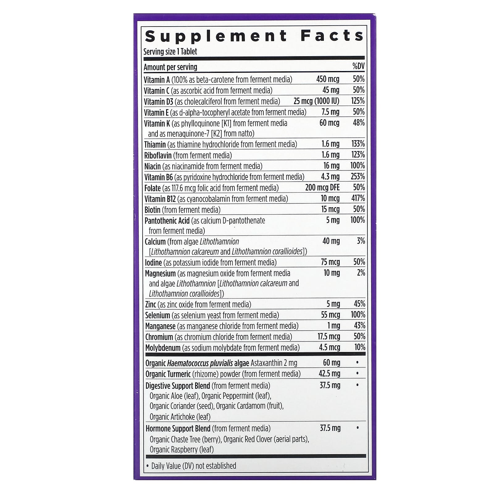 Meios de fermentação (farinha de soja orgânica, Saccharomyces cerevisiae orgânico, casca de laranja orgânica em pó, pó de cenoura orgânica, pó de alfafa orgânica, bactéria do ácido lático [Lactobacillus acidophilus, Bifidobacterium bifidum e Lactobacillus rhamnosus], papaína [desativada], bromelaína [desativada], goma de acácia orgânica; menos de 2% de: sílica, resina de laca e cera de carnaúba.